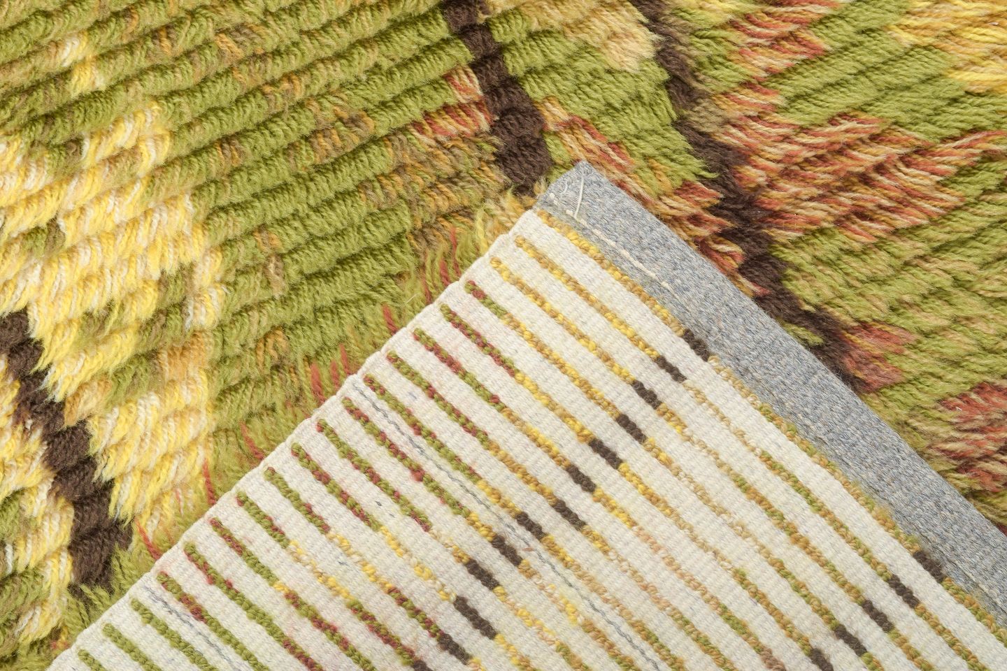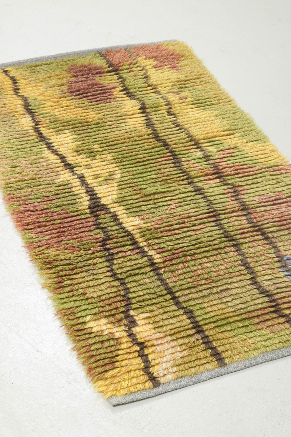 Håndknyttet rya-tæppe i ren uld med abstrakt mønster i grønne, gule, brune og cremefarvede toner. Et dekorativt tekstil med karakteristisk struktur og farvespil, typisk for skandinavisk design i perioden.
