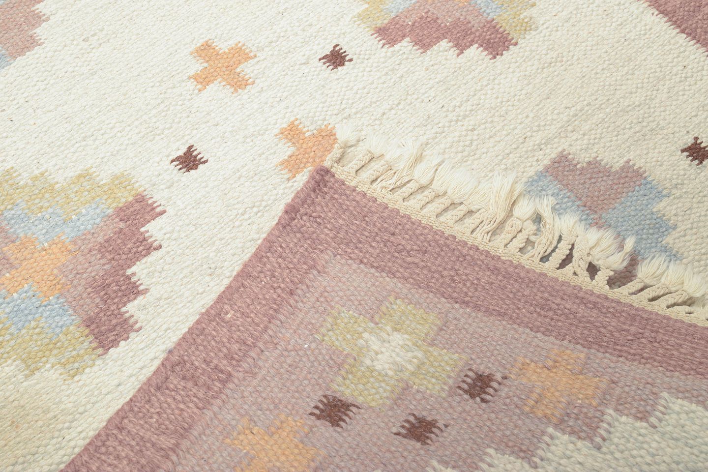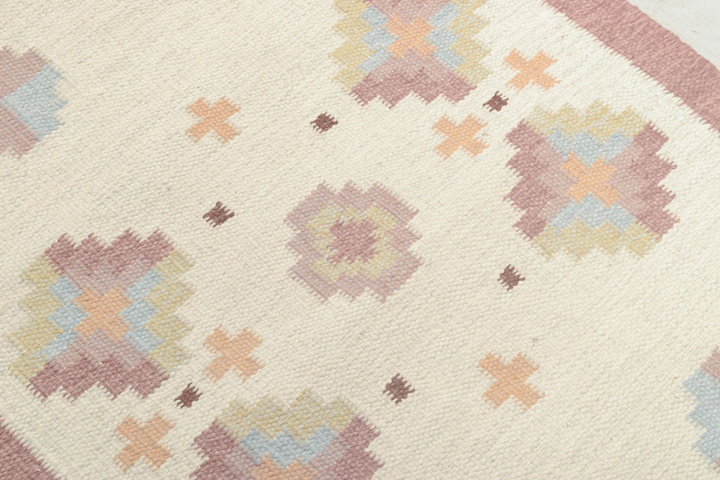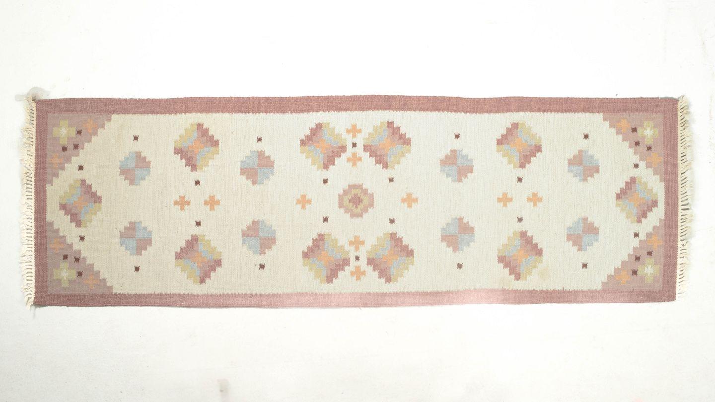 Håndvævet rölakan-løber i uld med symmetrisk, geometrisk mønster i lyse pasteltoner af rosa, blå, gul og beige. Et fint eksempel på svensk håndværkstradition med fokus på farveharmoni og enkel formgivning.