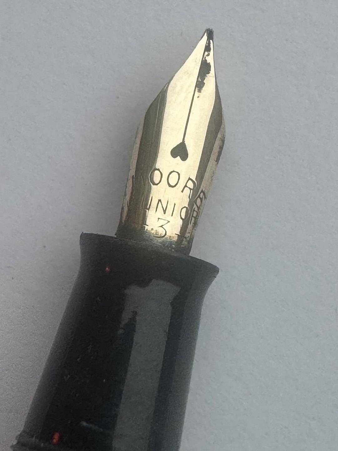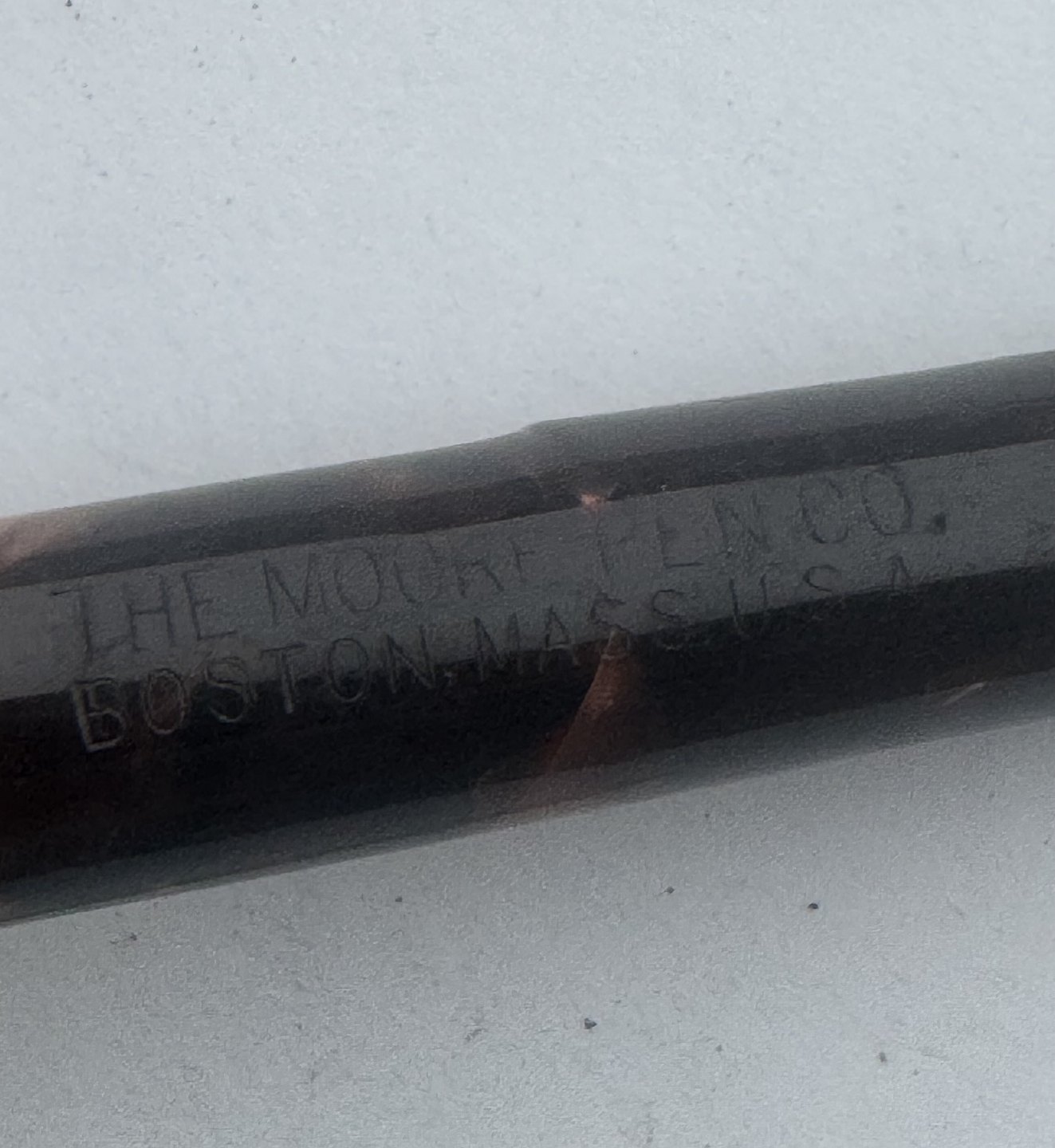 Grøn marmoreret fyldepen med lever filler fra The Moore Pen Company. Fremstillet i U.S.A. omkring 1940. Fungerer ikke. Der skal indsættes ny gummisæk før end den igen kan optage blæk og skrive igen. Fyldepennen fremstår ellers i god stand uden skader eller reparationer. Alle dele originale og fra den oprindelige periode.