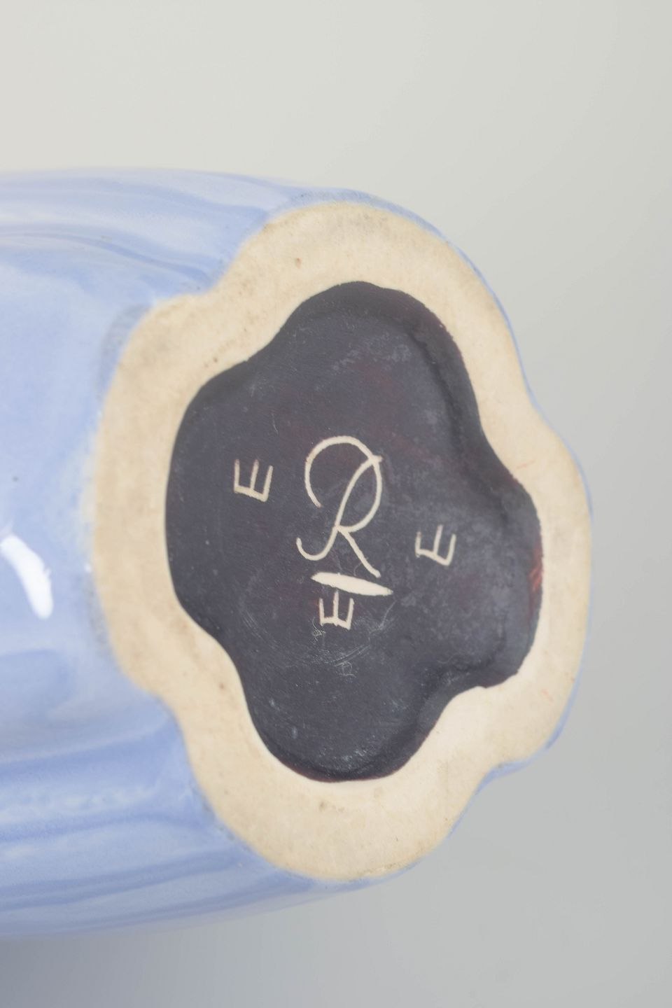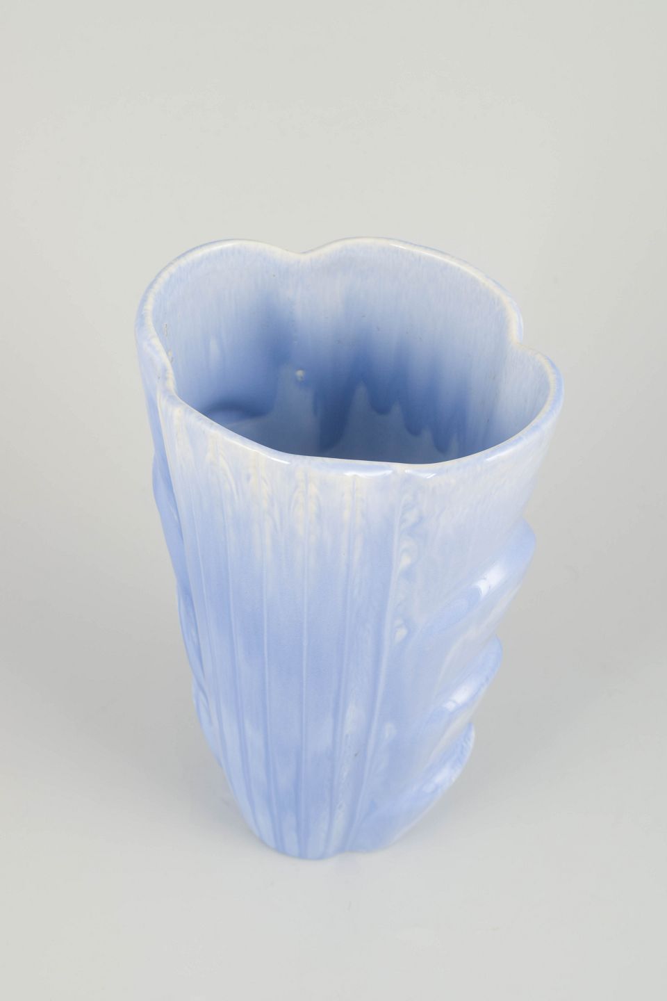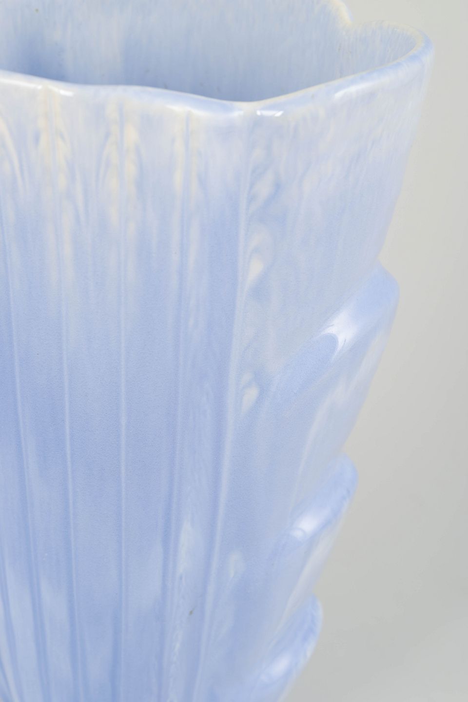 Impressive ceramic vase with a sculptural, organic form and light blue glaze with a pearlescent sheen. A refined example of Rörstrand’s mid-century design language. Marked as 2nd quality.