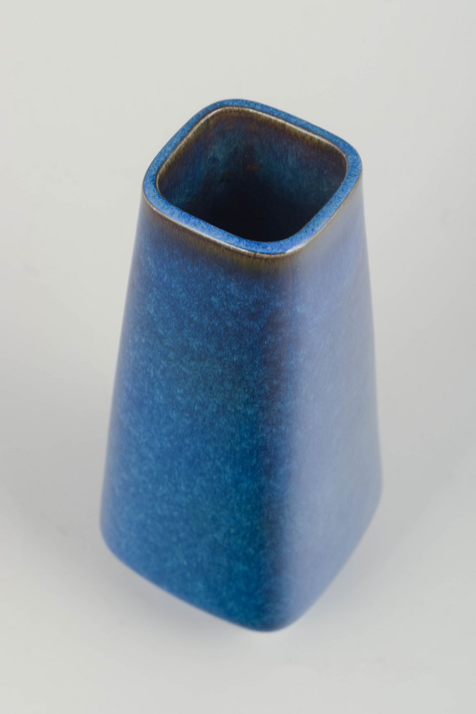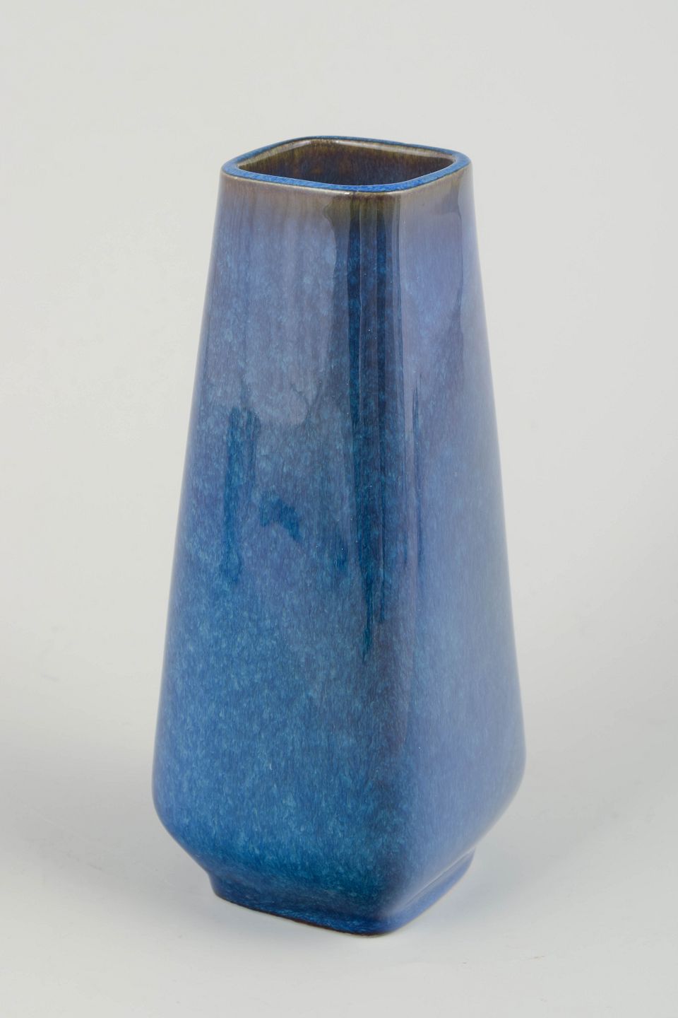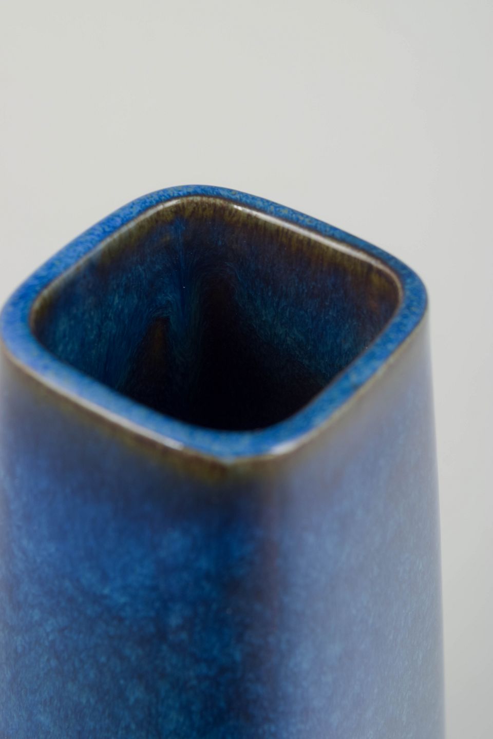 Rectangular stoneware vase with hand-applied lagoon-blue glaze in vivid shades of azure, cobalt, and grey. A refined example of Gustavsberg’s mastery of glazing from the period, combining modernist form with a deeply tactile and luminous surface.