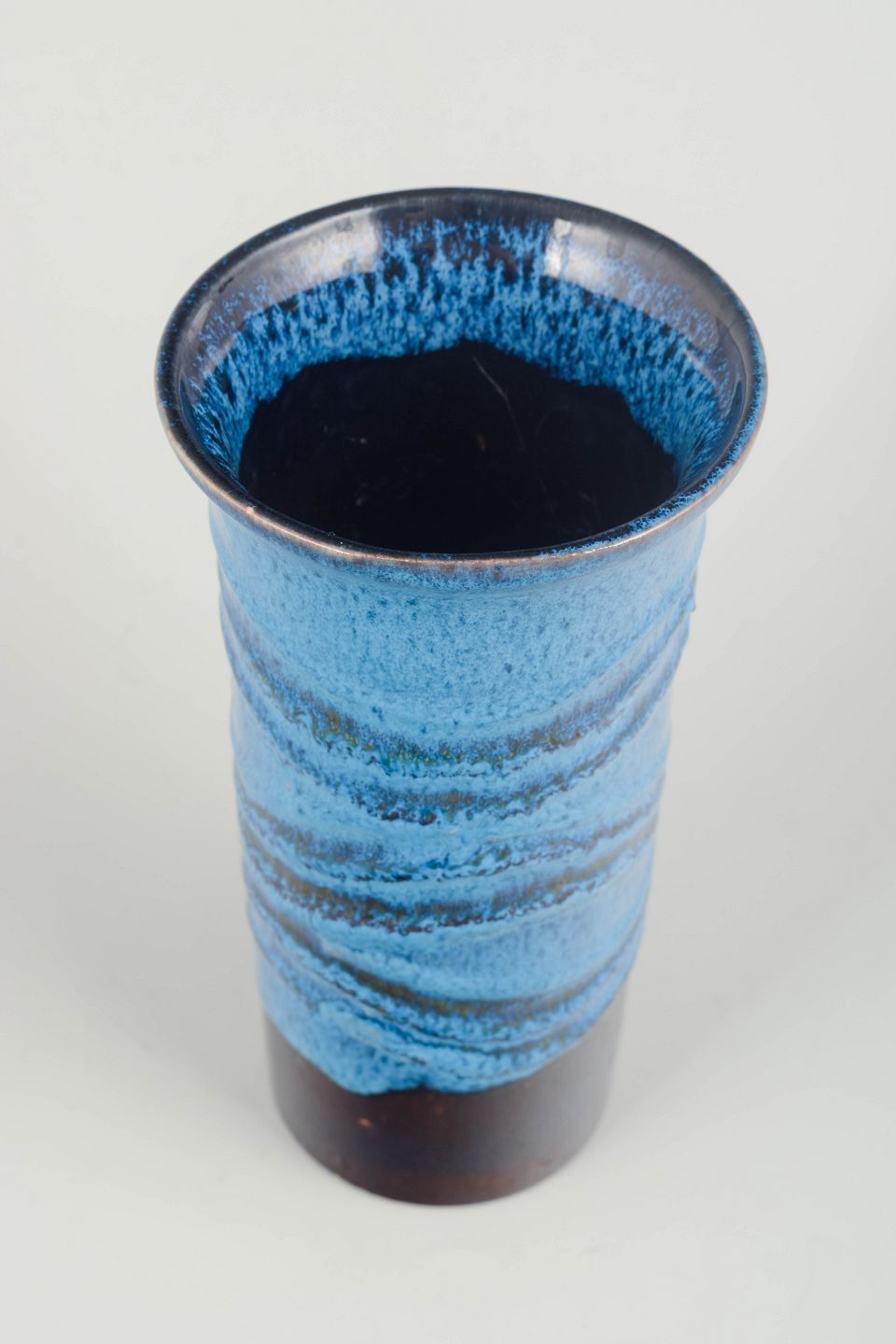 Hånddrejet keramisk vase i stentøj med kraftig, glansfuld glasur i nuancer af turkisblå og brun. Den foldede, teksturerede overflade giver vasen en skulpturel karakter og vidner om tidens eksperimenterende formsprog inden for nordisk studiokeramik.