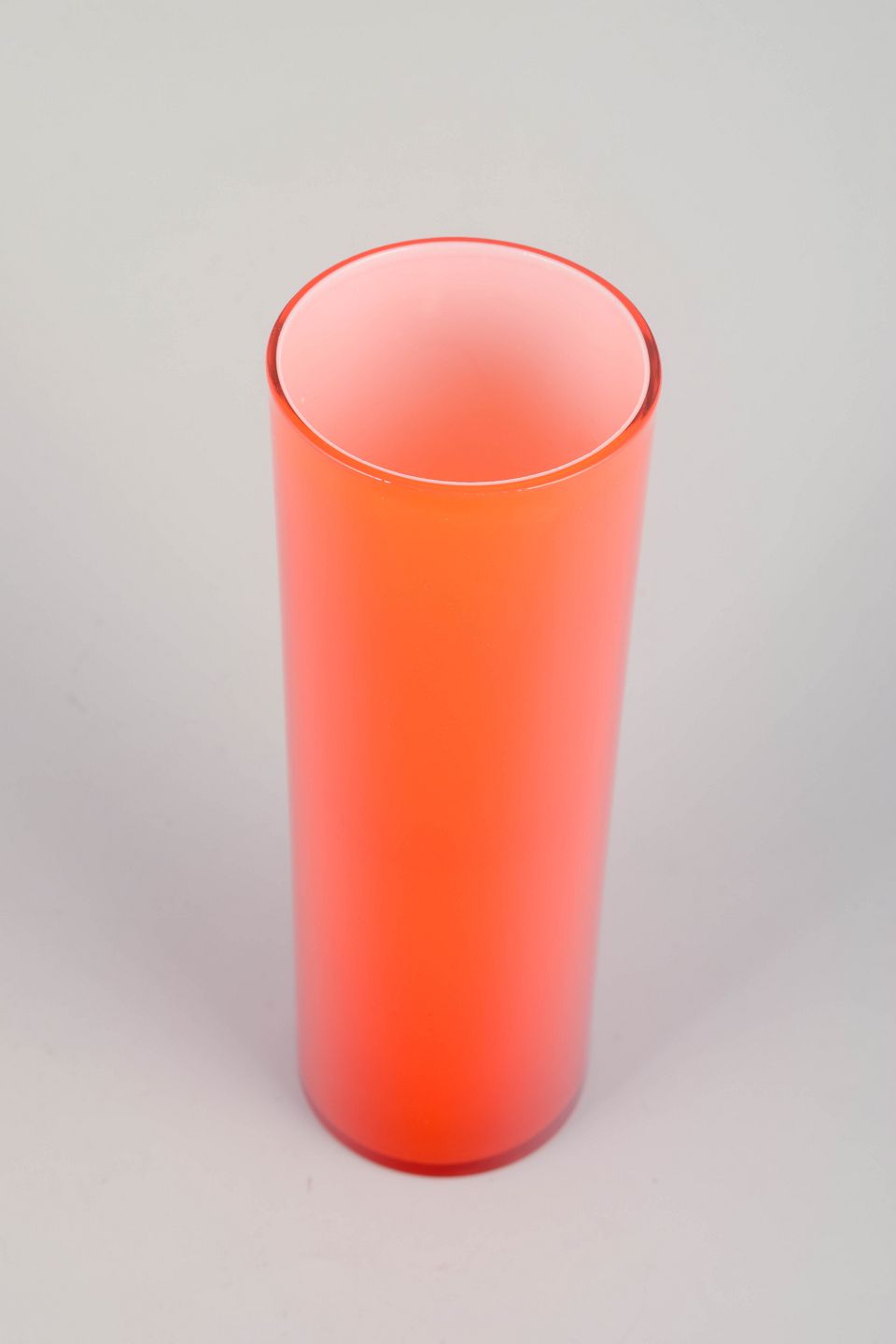 Elegant, mundblæst vase i klart orange glas med slank, cylindrisk form. Et tidstypisk eksempel på svensk glaskunst fra 1970’erne, hvor rene linjer og stærke farver spillede en central rolle i designudtrykket.