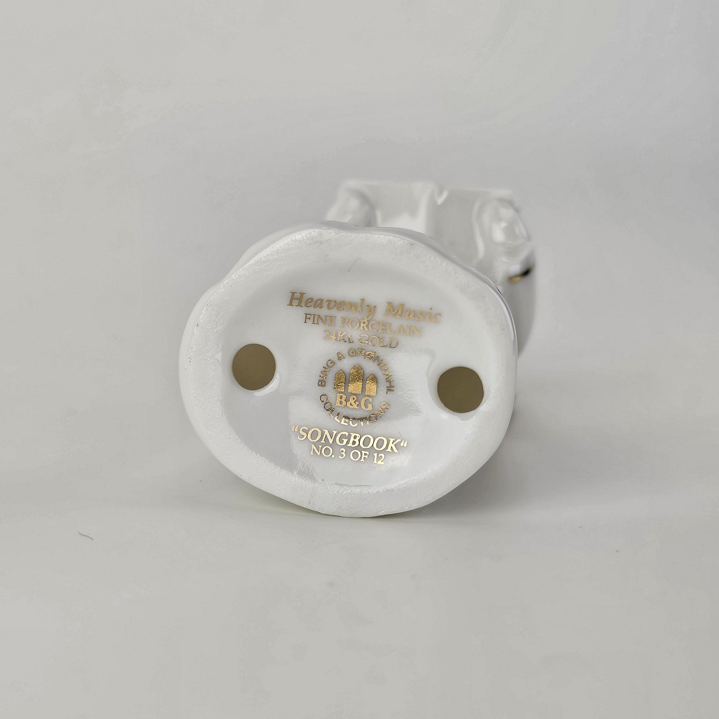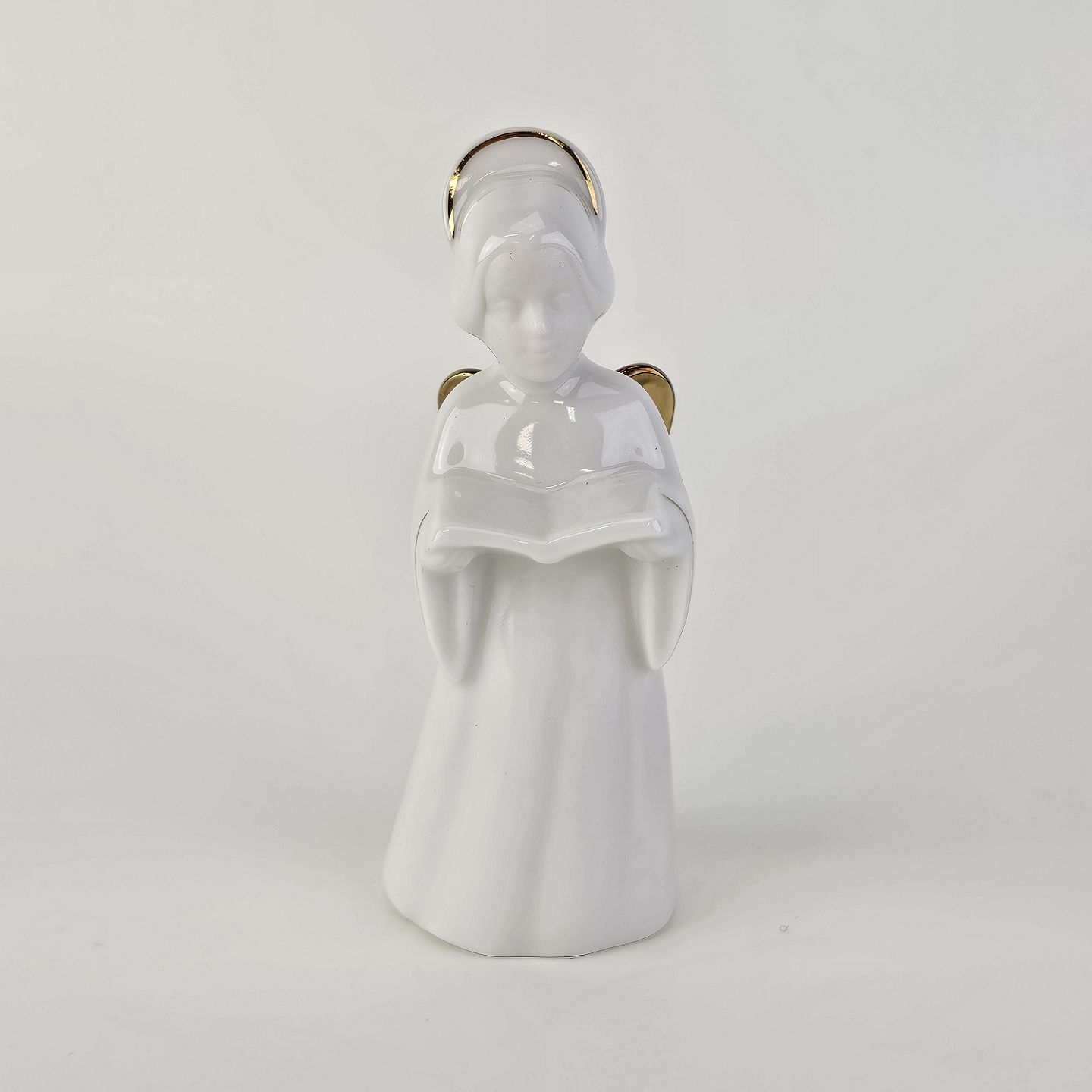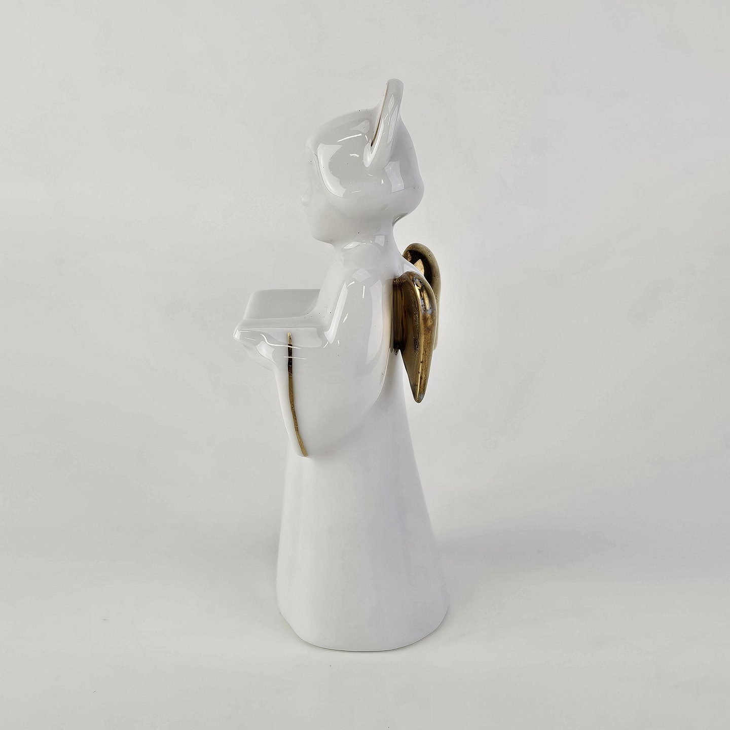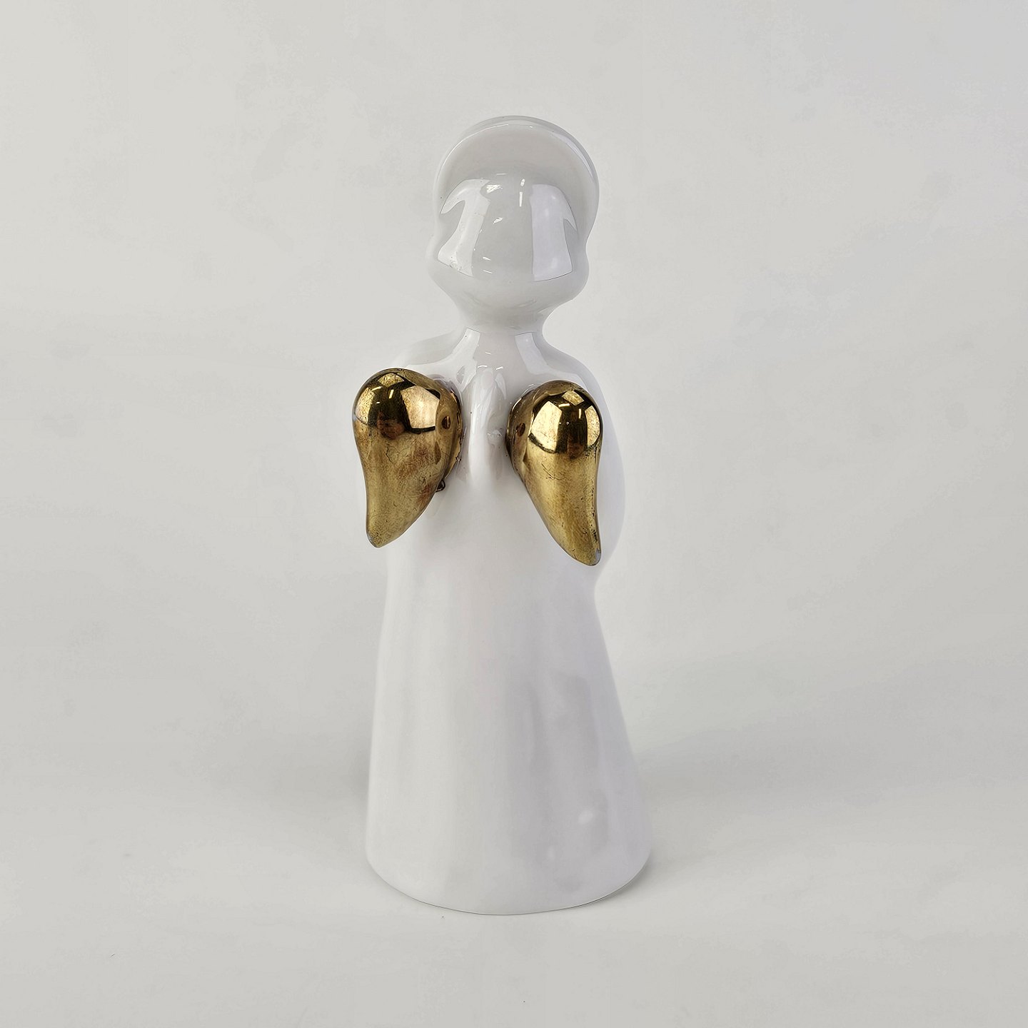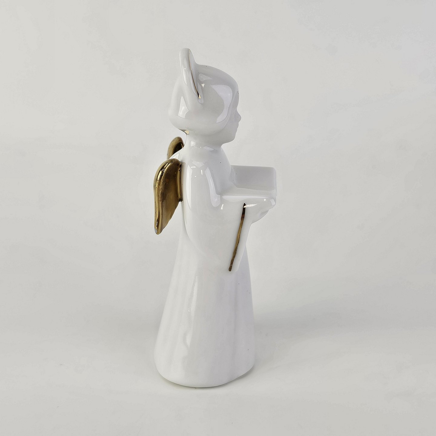 Figur med motiv af en engel med en sandbog. Figuren er i hvidt porcelæn med forgyldte vinger og detaljer i 24 karat guld.