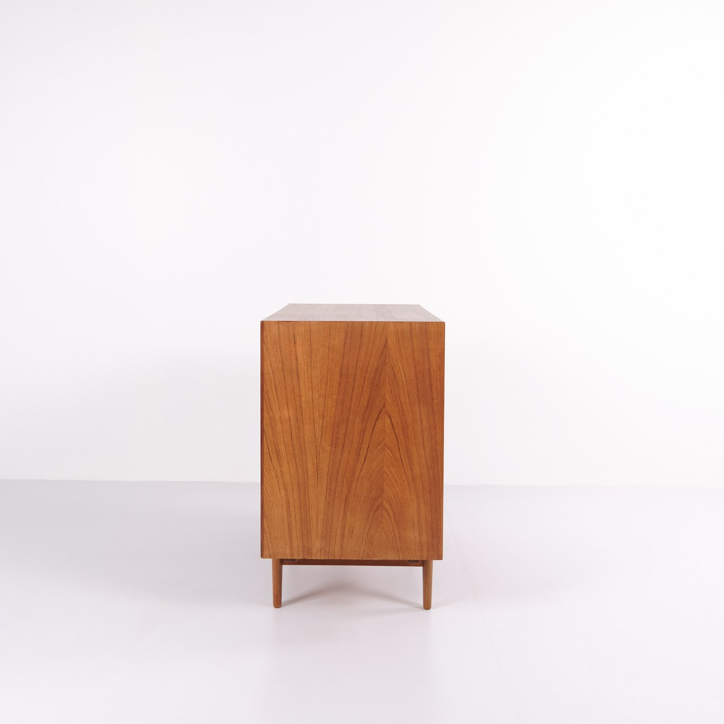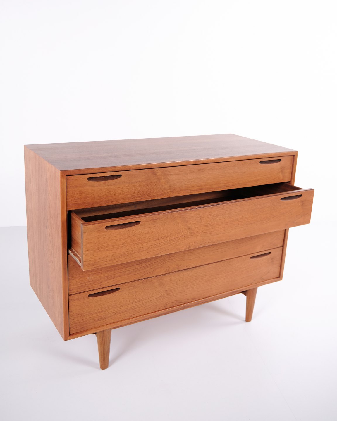 Kommode designet af Ib Kofod-Larsen og fremstillet af Brande Møbelfabrik i 1950’erne. Kommoden er udført i teaktræ med fire rummelige skuffer og karakteristiske, enkle greb, som understreger Kofod-Larsens rene og funktionelle formsprog.