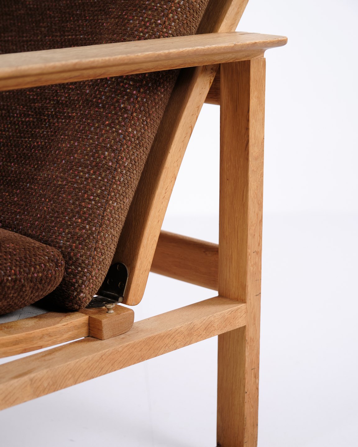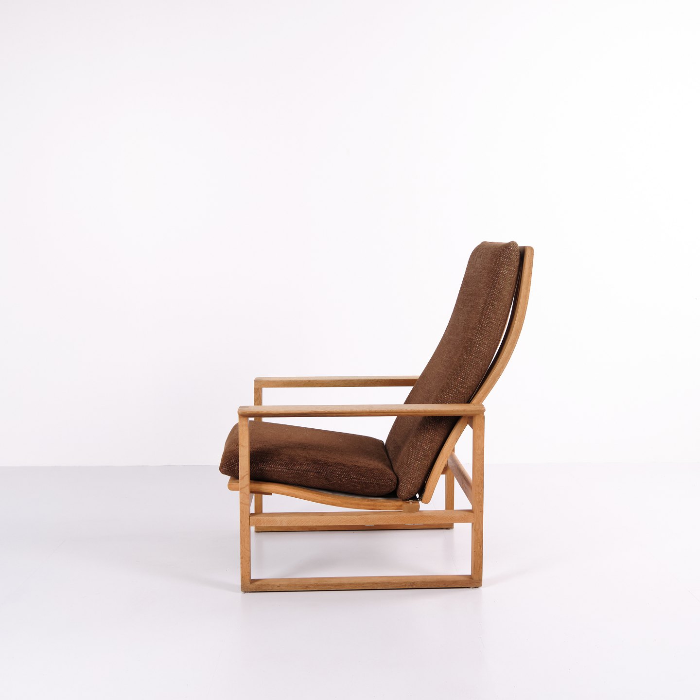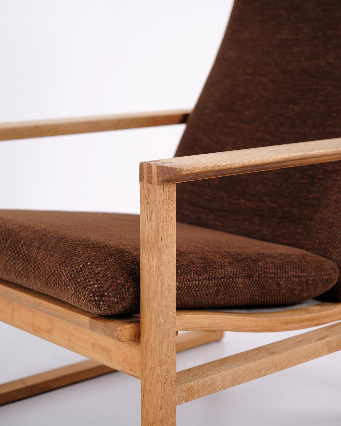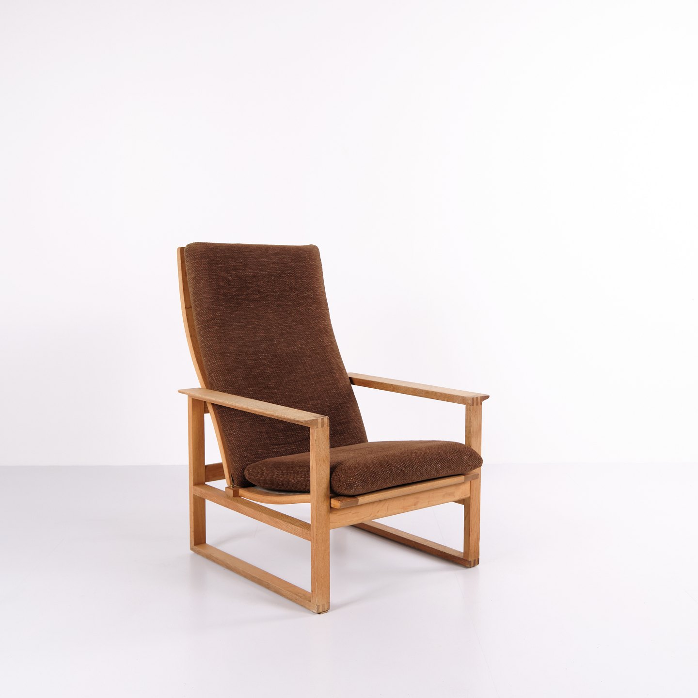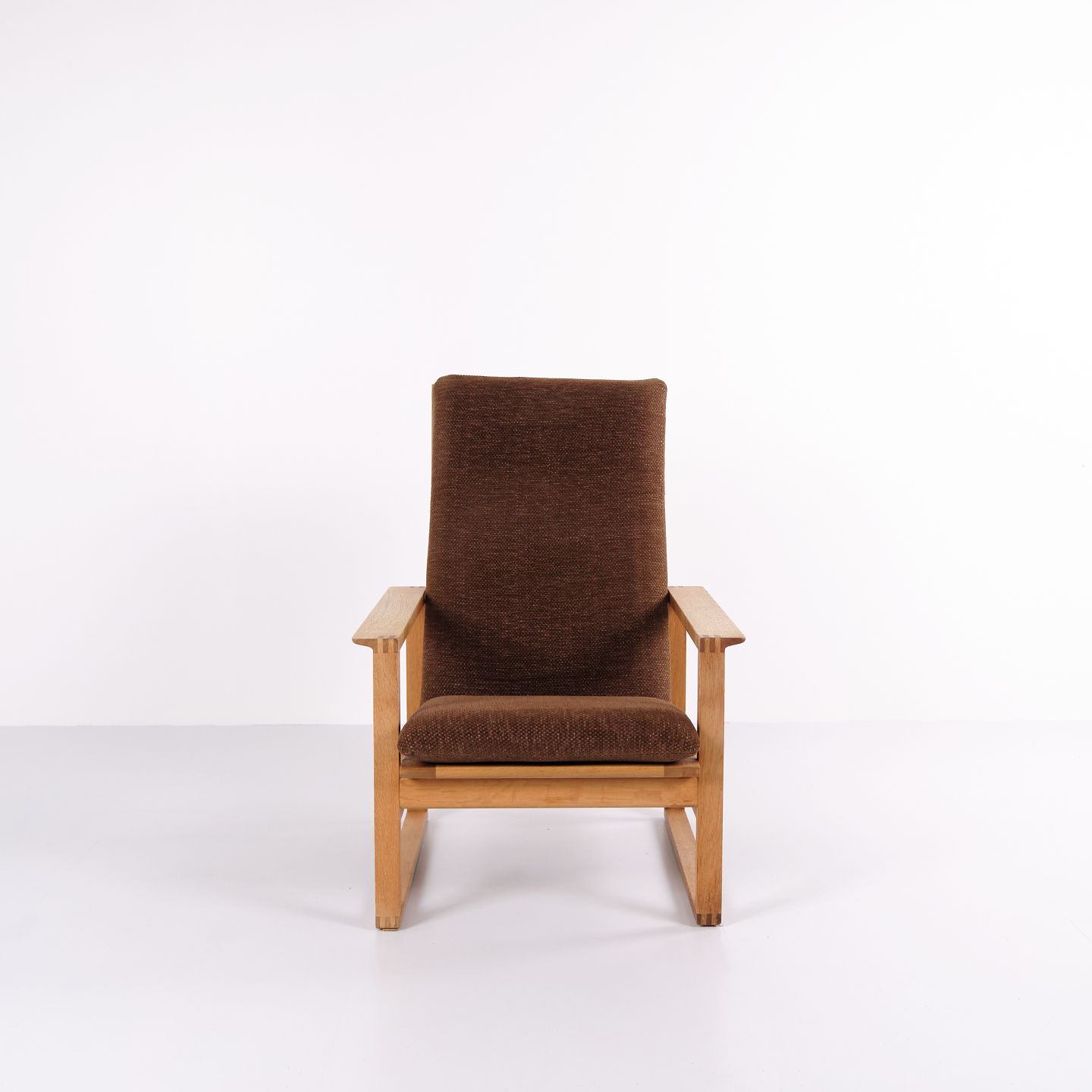 Børge Mogensen slædestol BM2254 fra Fredericia Stolefabrik. Egetræ med brune hynder.