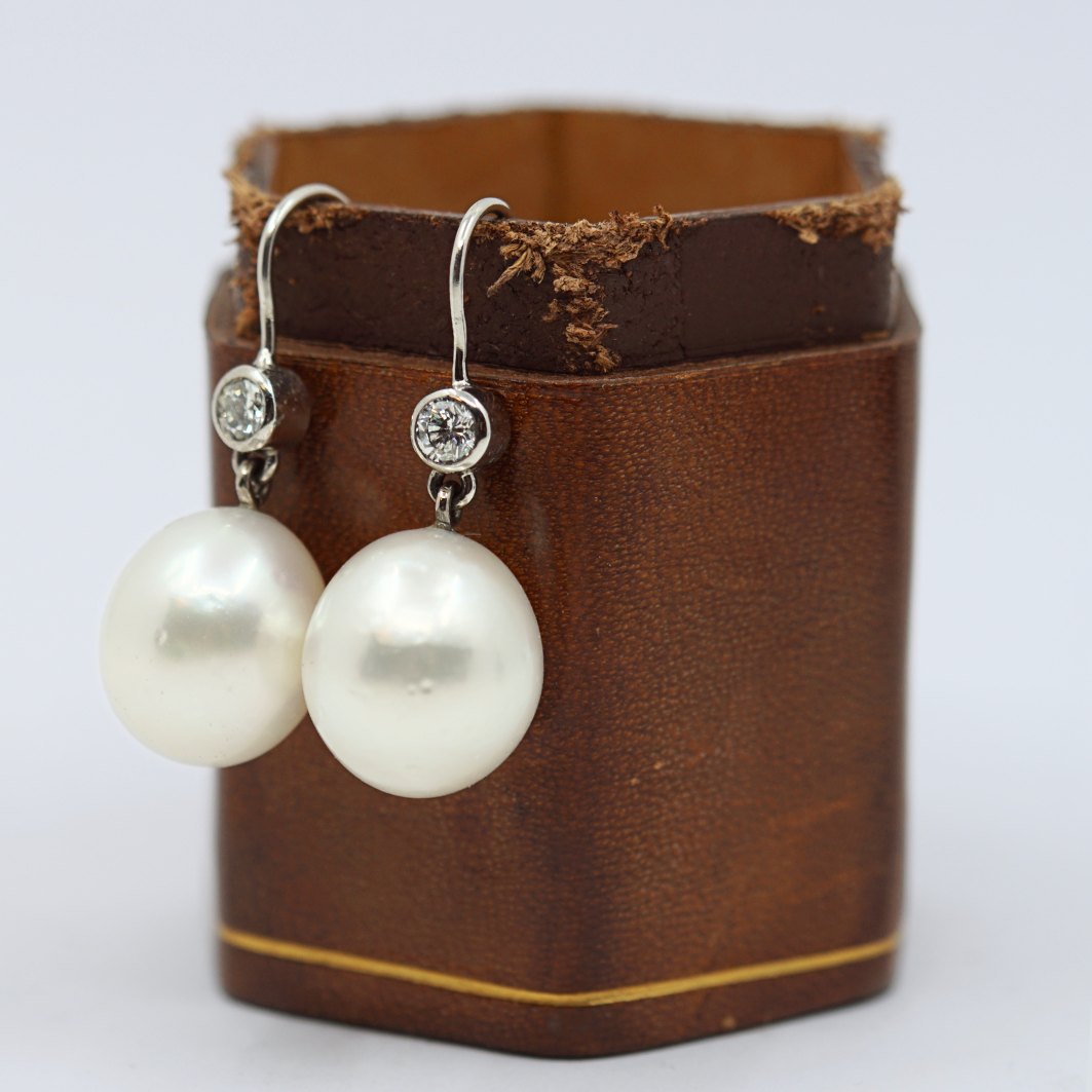 Heinitz Leth; Par øreringe med southsea perler og diamanter, i 14kt. hvidguld