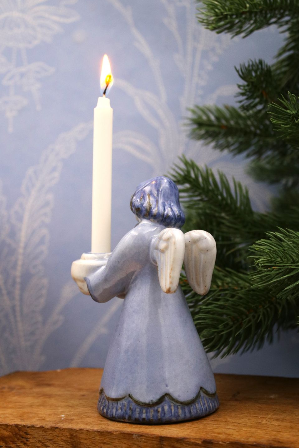 L. Hjorth ceramic large angel with blue glaze holding a small candle. No.419.