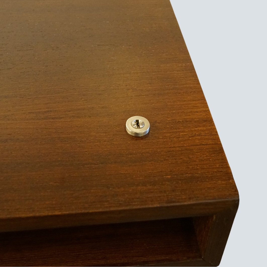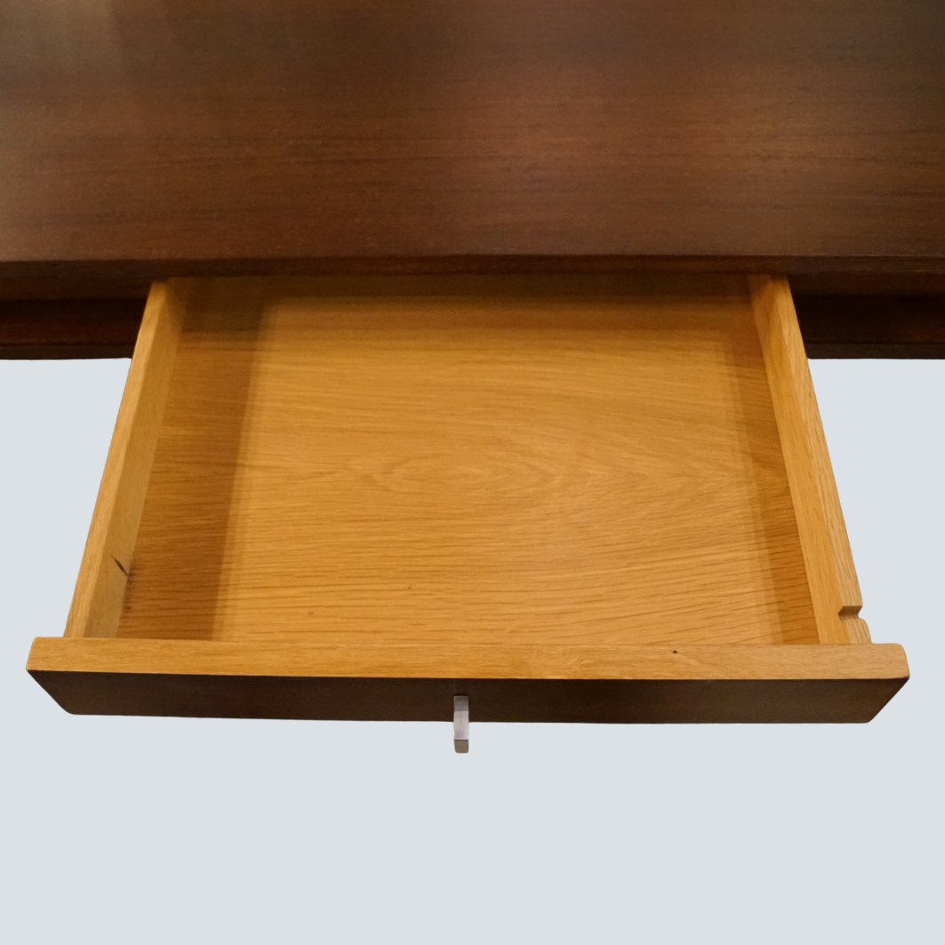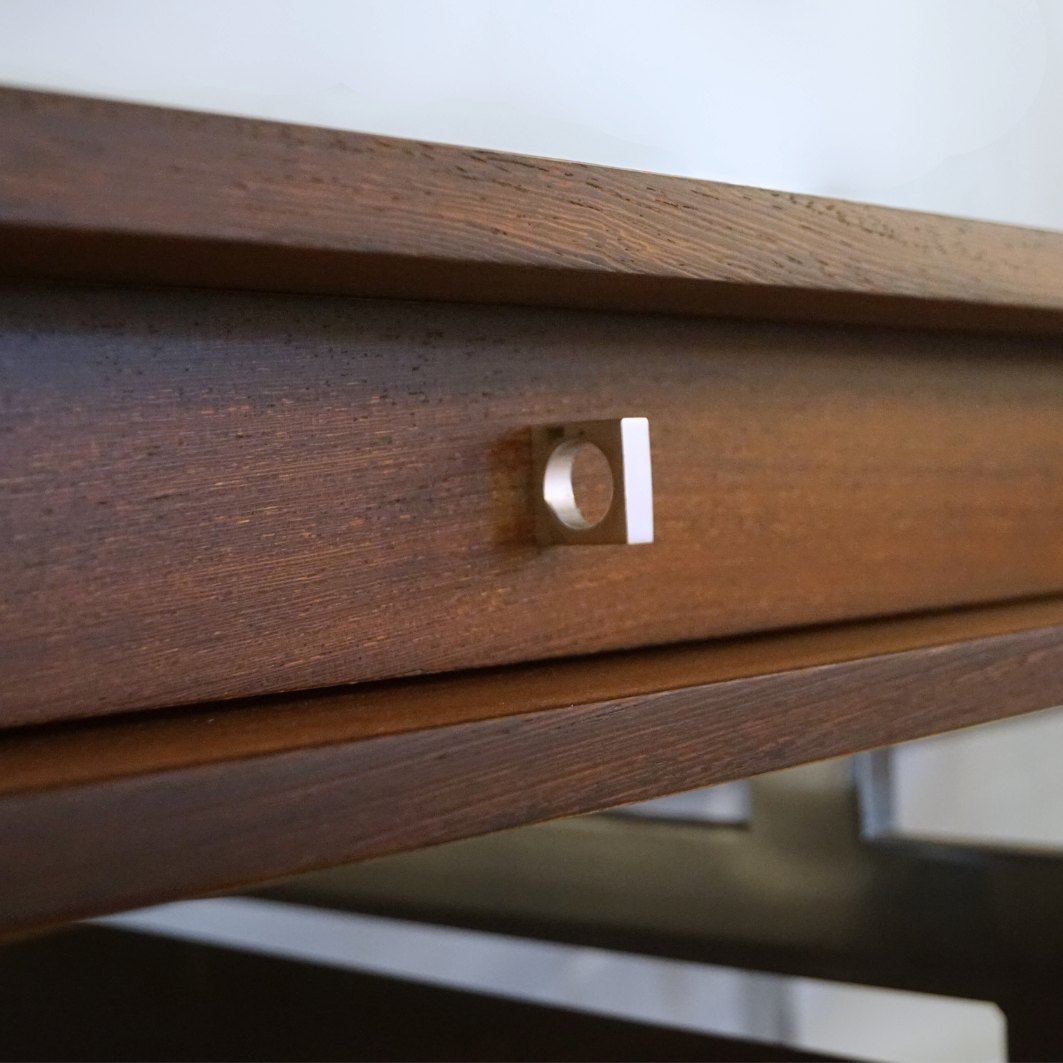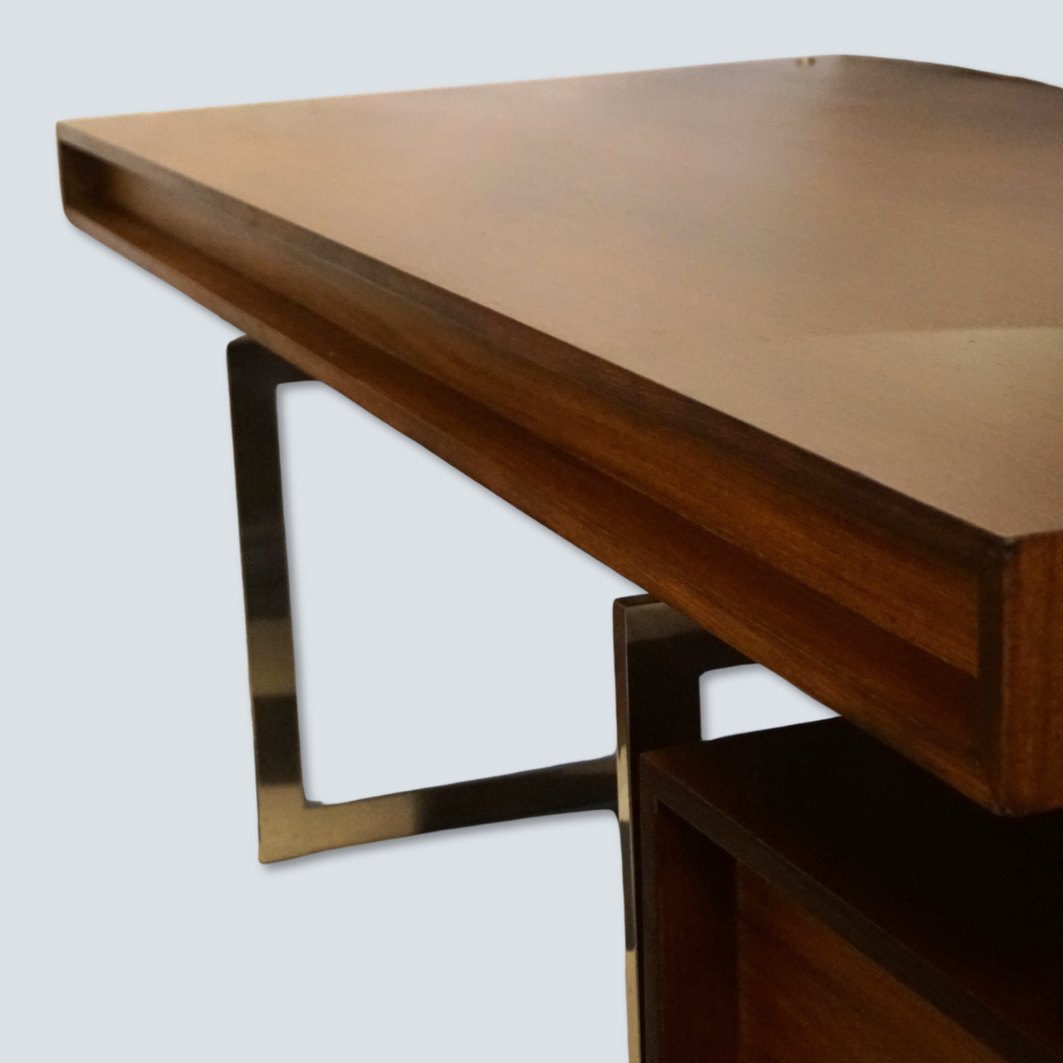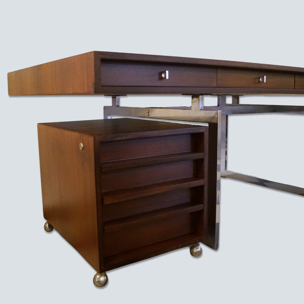 Bodil Kjær fritstående skrivebord af Wengé træ og ben i forkromet stål. Fire skuffer med centrallås. Skuffemodul på hjul medfølger. Tegnet af Bodil Kjær i 1959. Ikonisk design, også kaldt "Det smukkeste skrivebord i verden" og ses blandt andet i James Bond filmene.
