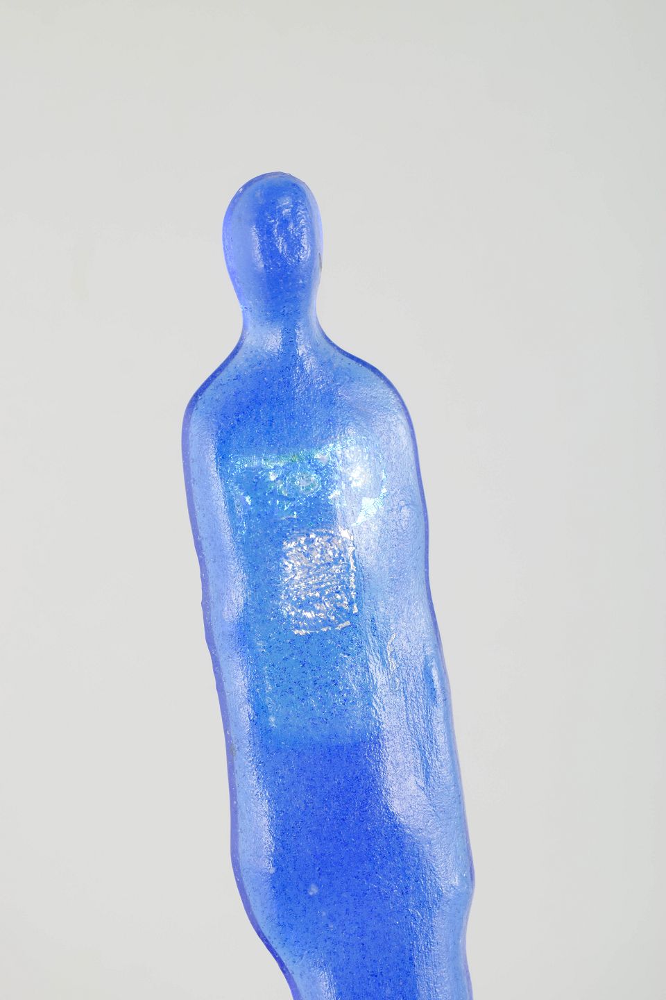 Håndformet figur udført i intenst koboltblåt glas med metallisk skær og minimalistisk formgivning. Et skulpturelt værk, der forener menneskets silhuet med Ekegrens karakteristiske eksperimenterende udtryk og farvedybde.