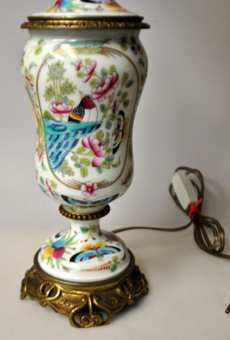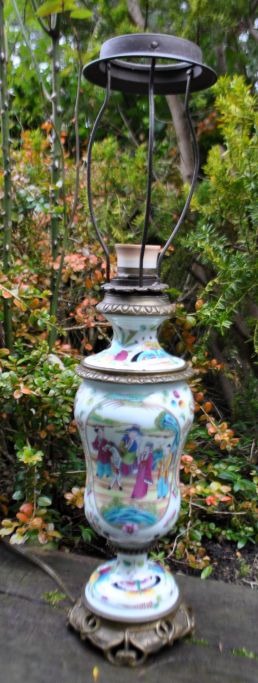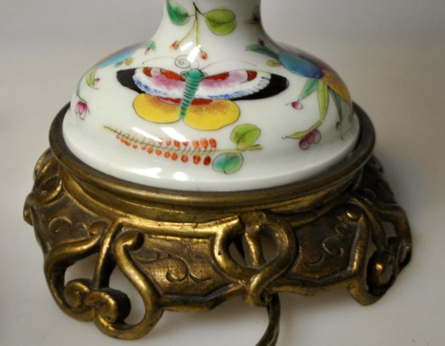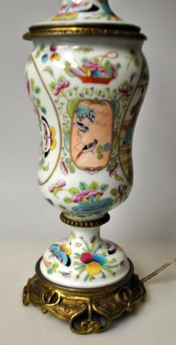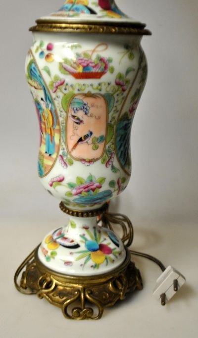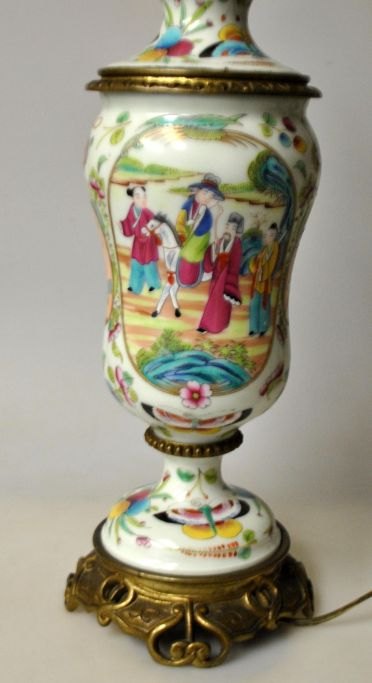 Canton bordlampe, ca. 1900, Kina. Tidligere petroleumslampe omgjort til el. Porcelæns korpus med div. emaljebemalinger, bl.a. med sceneri med kvinde på en hest, sommerfugle og frugter. Med fod af bronze. H.: 36 cm. Højde med el montering: 55 cm.