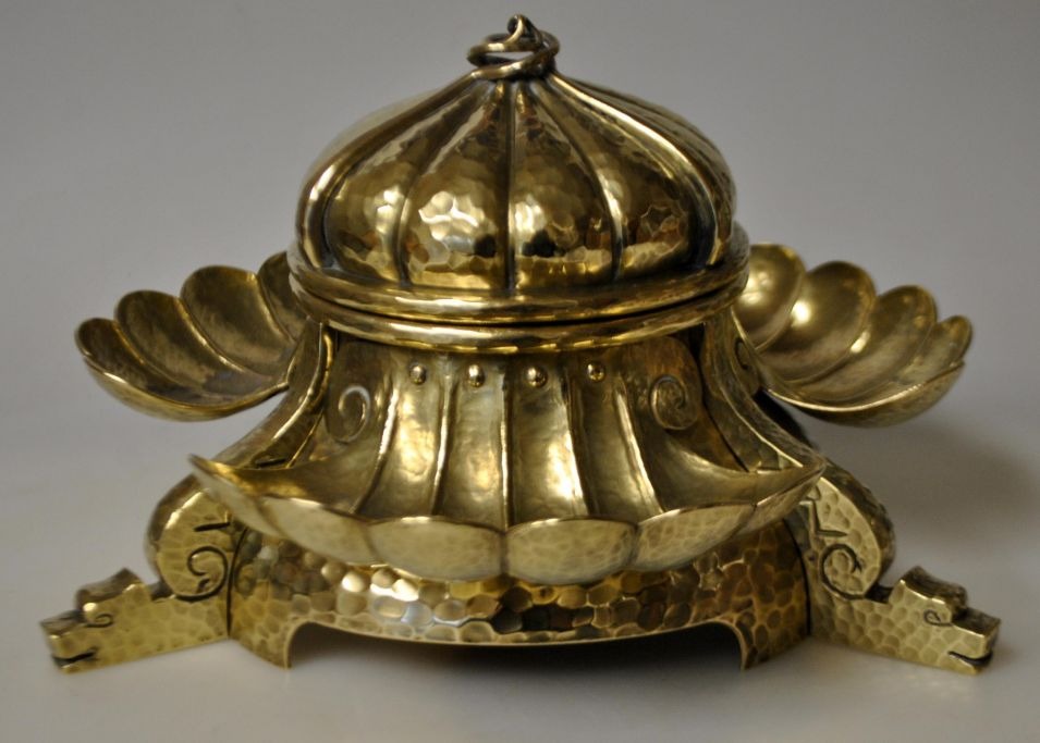 Stort messing blækhus, art deco, ca. 1920, Danmark.  Med dragefødder. Hamret. Indvendig ed glas blækhus. H.: 14 cm. Dia.: 22 cm.