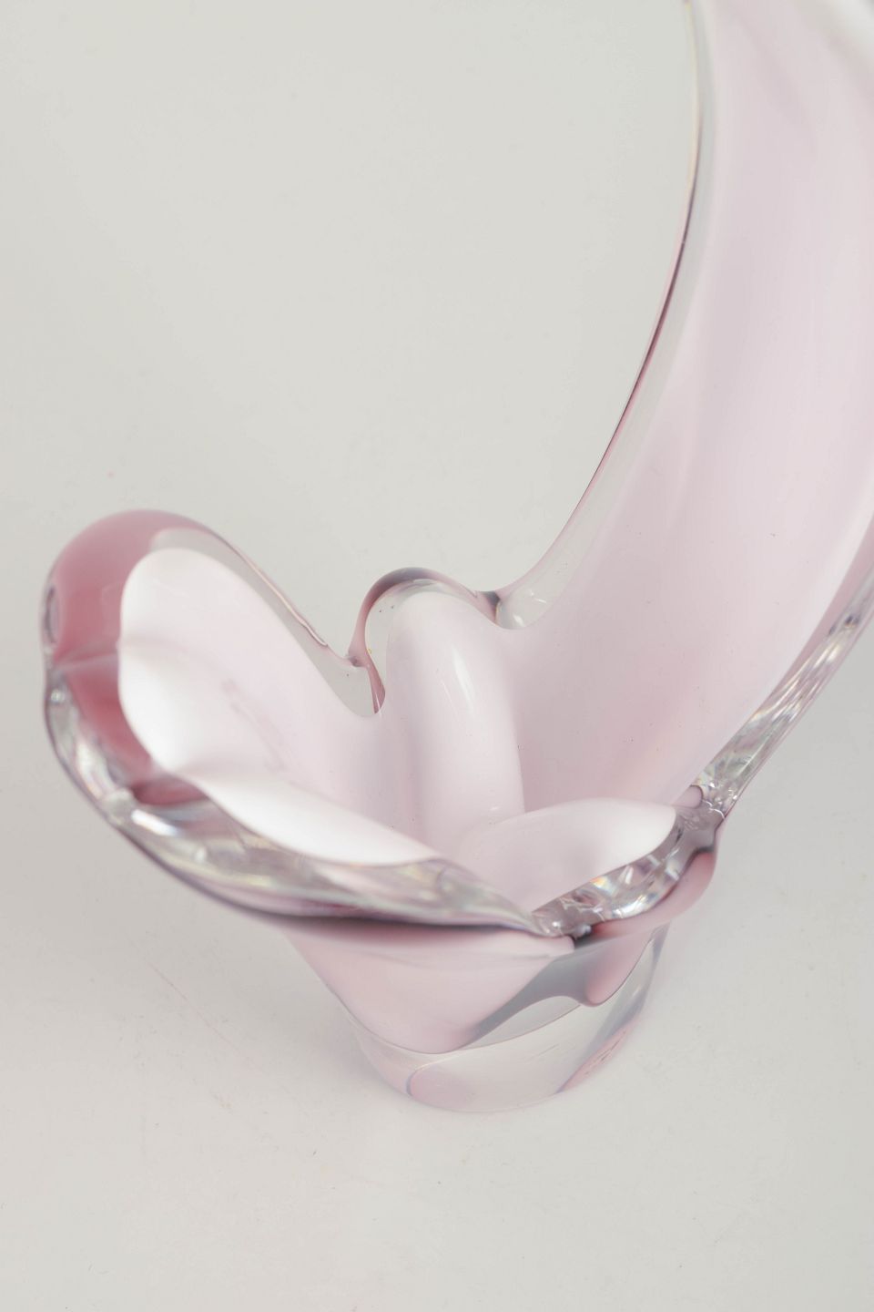 Elegant “Coquille”-form i flerlaget kunstglas med rosa til lys violet indfarvning, hvidt mellemlag og klart yderlag. Den høje, svungne, bladlignende form er typisk for Kedelvs mest organiske og skulpturelle designudtryk.
