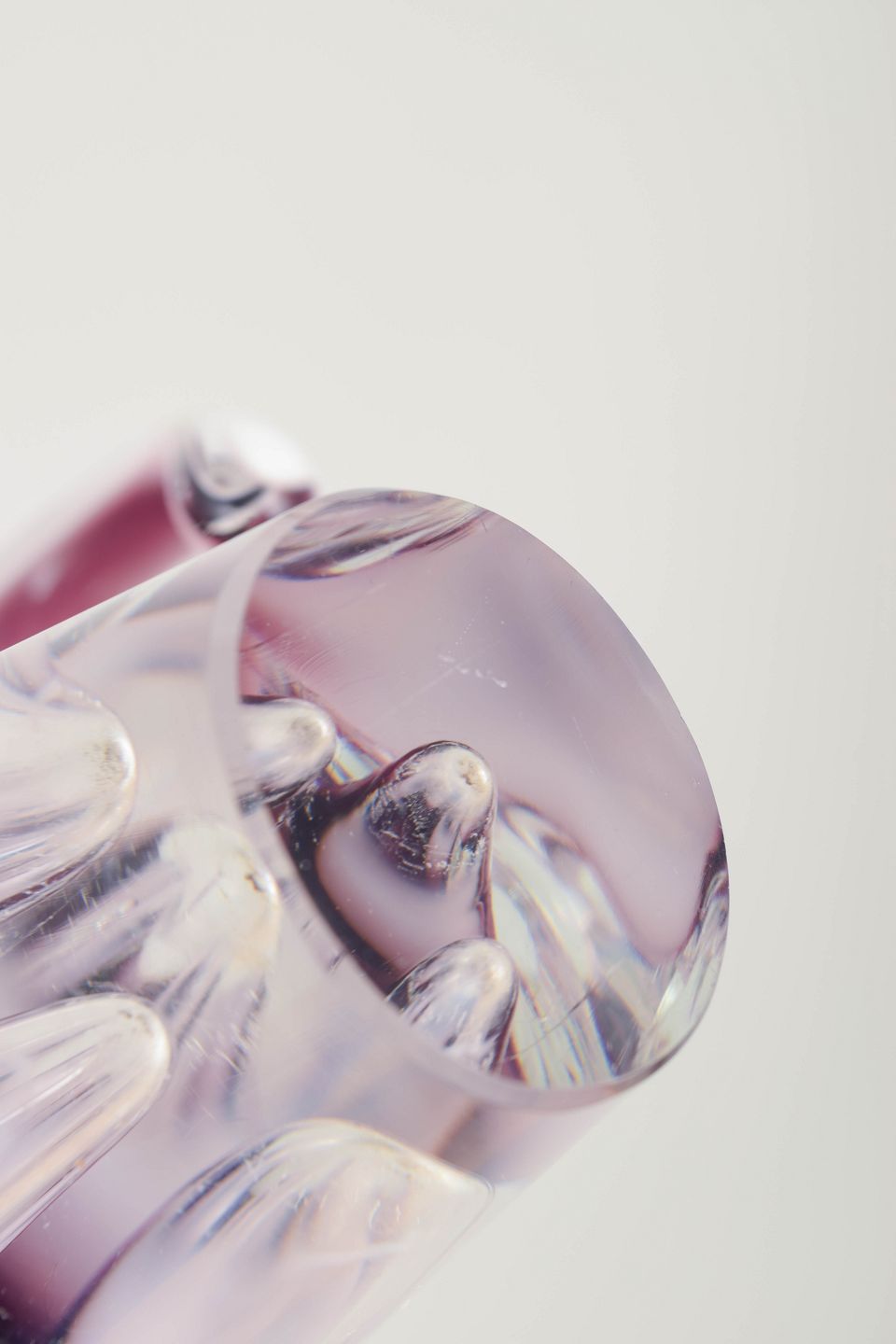 Imponerende flerarms “Coquille”-skål i flerlaget kunstglas med rosa indfarvning, hvidt mellemlag og klart yderglas. De tre svungne, opadstræbende arme giver et markant, næsten blomsteragtigt udtryk, typisk for Kedelvs mest skulpturelle arbejder.