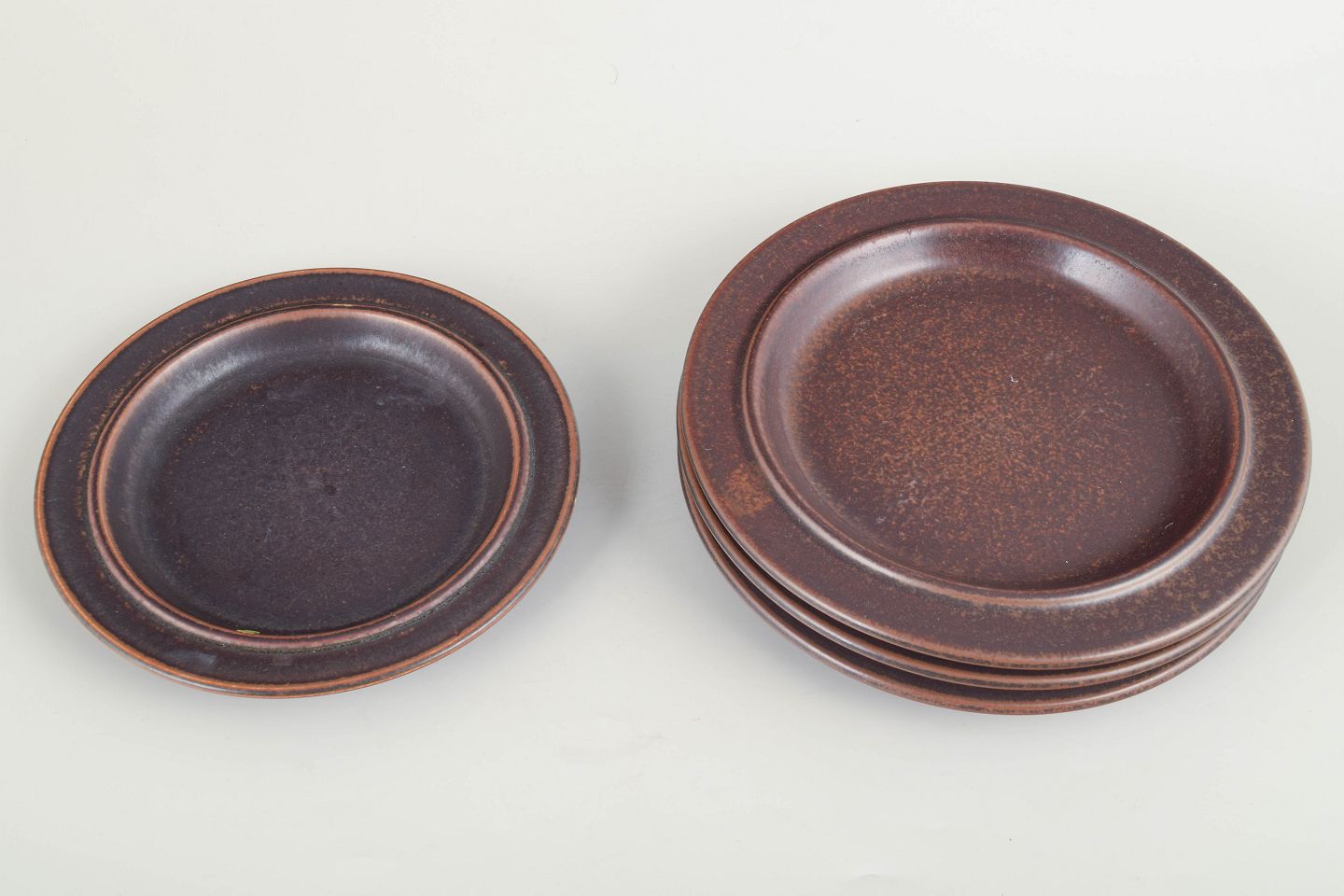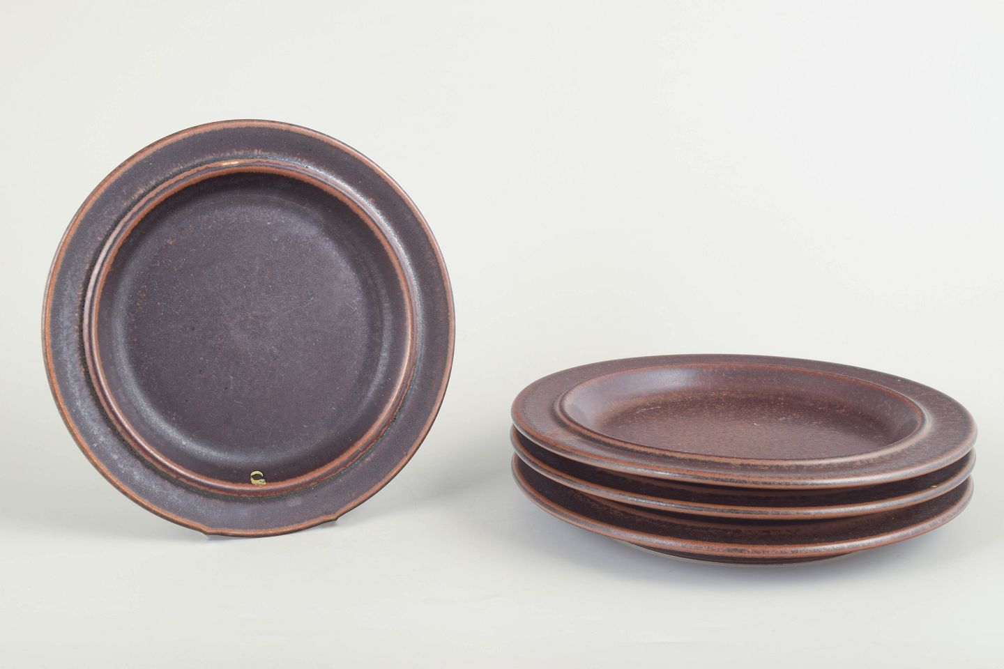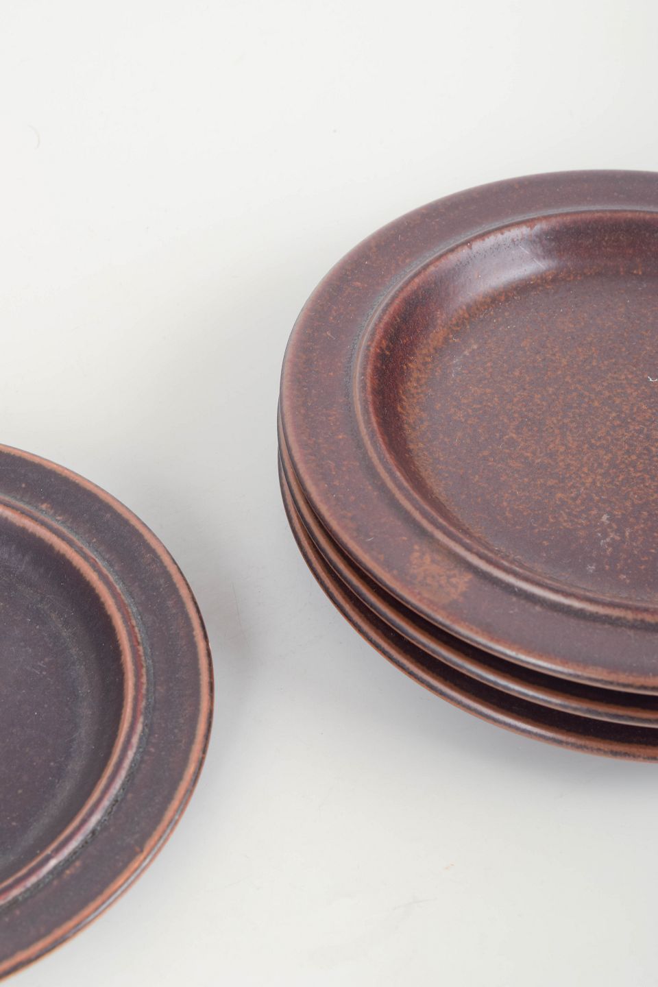Four smaller plates from the iconic “Ruska” series, crafted in dark brown stoneware with the characteristic matte iron-brown glaze that varies subtly in tone and texture.