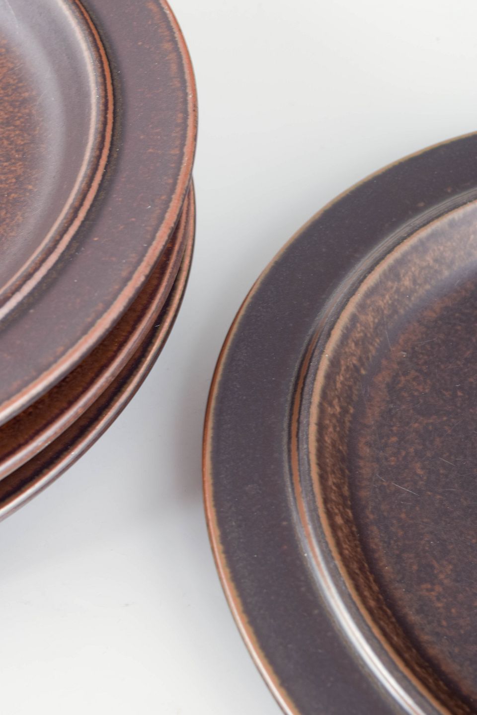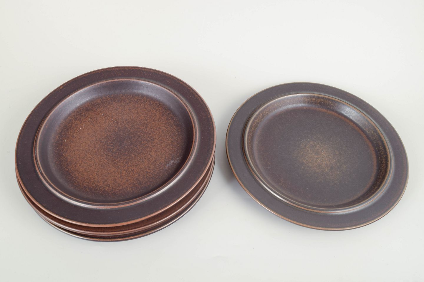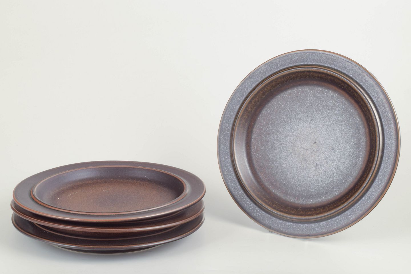 Fire middagstallerkener i mørkebrunt stentøj fra Arabia’s ikoniske “Ruska”-serie, kendetegnet ved den robuste chamotte-krop og den dybe, matbrune jernglasur med naturlige nuancer.