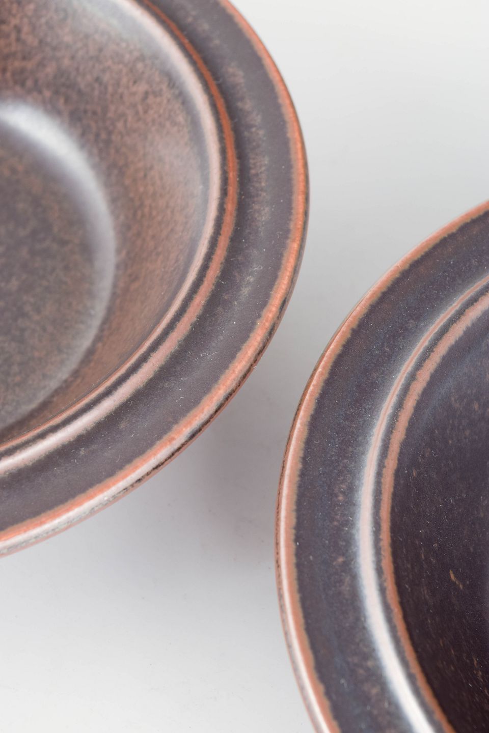 To dybe tallerkener i mørkebrunt stentøj fra Arabia’s ikoniske “Ruska”-serie, kendt for sin robuste chamotte-krop og den karakteristiske, varierende matbrune jernglasur.