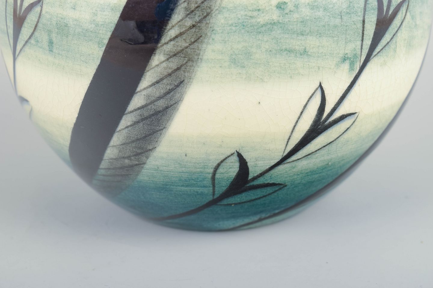 Art Deco-inspireret vase i glaseret fajance med håndmalet dekor i blå, grønne og sorte nuancer. Den svungne krop og riflede, udsvajede hals fremhæver periodens dekorative formsprog.