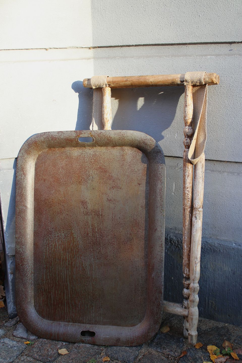 stor rå metalbakke på toppen. H: 68cm. L&B: 76,55,5cm.