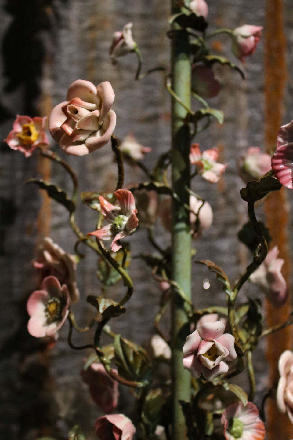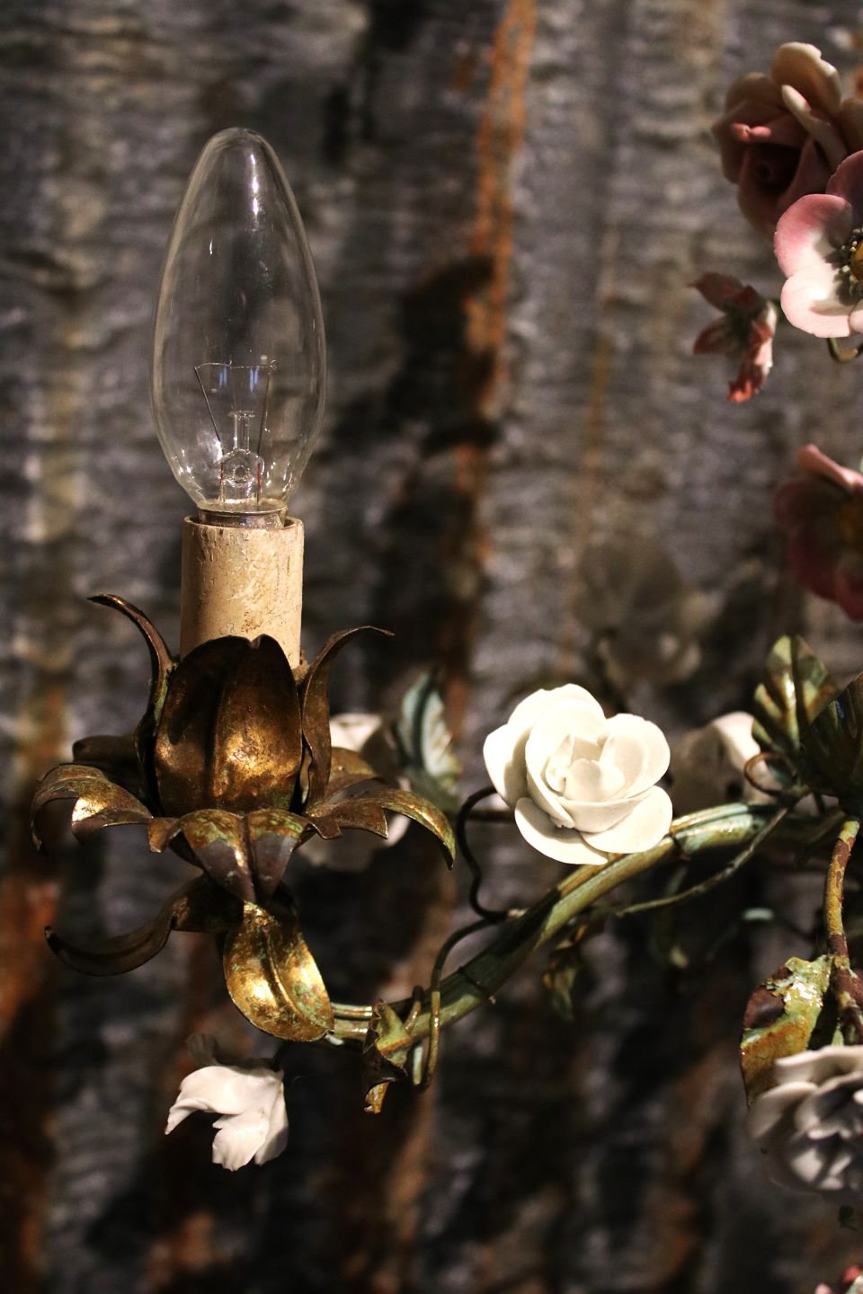 Gammel fransk lysekrone med base i grønmalet metal stel dekoreret med en masse små fine farvet / hvide porcelænsblomster.
