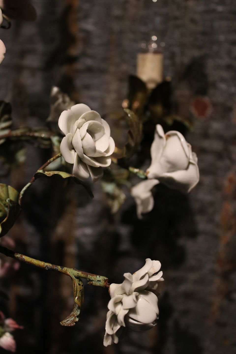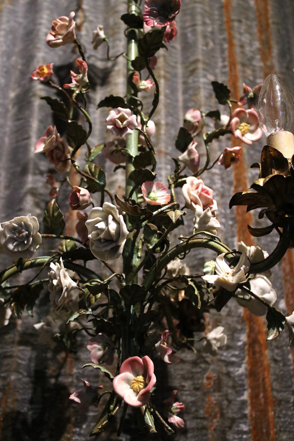 Gammel fransk lysekrone med i grønmalet metal dekoreret med fine farvet/hvide porcelænsblomster.