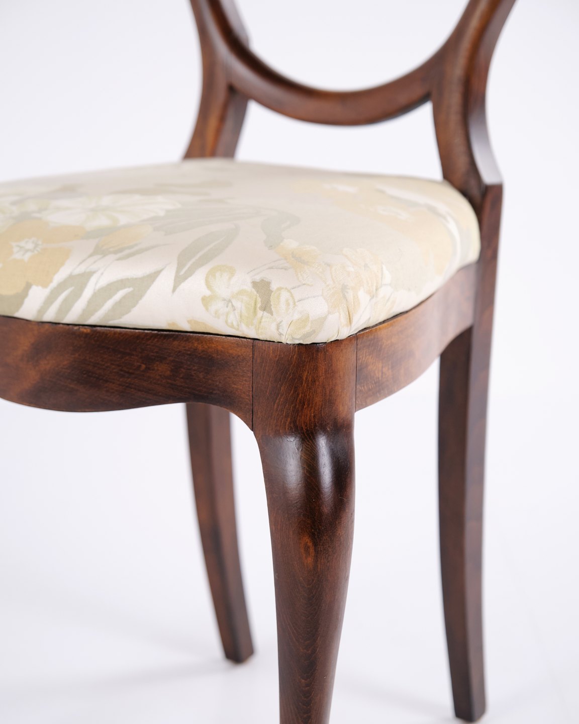 Sæt af fire salon-/spisestuestole fra 1860’erne, udført i mahogni og betrukket med lyst blomsterstof. Rokoko-inspireret design med udskårne detaljer og klassiske proportioner. Elegante stole til spisebord, stue eller entré.