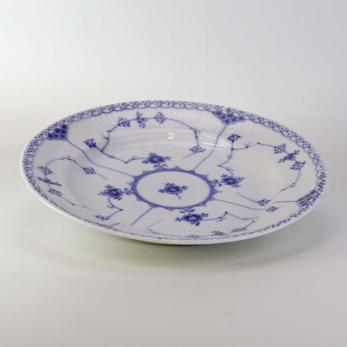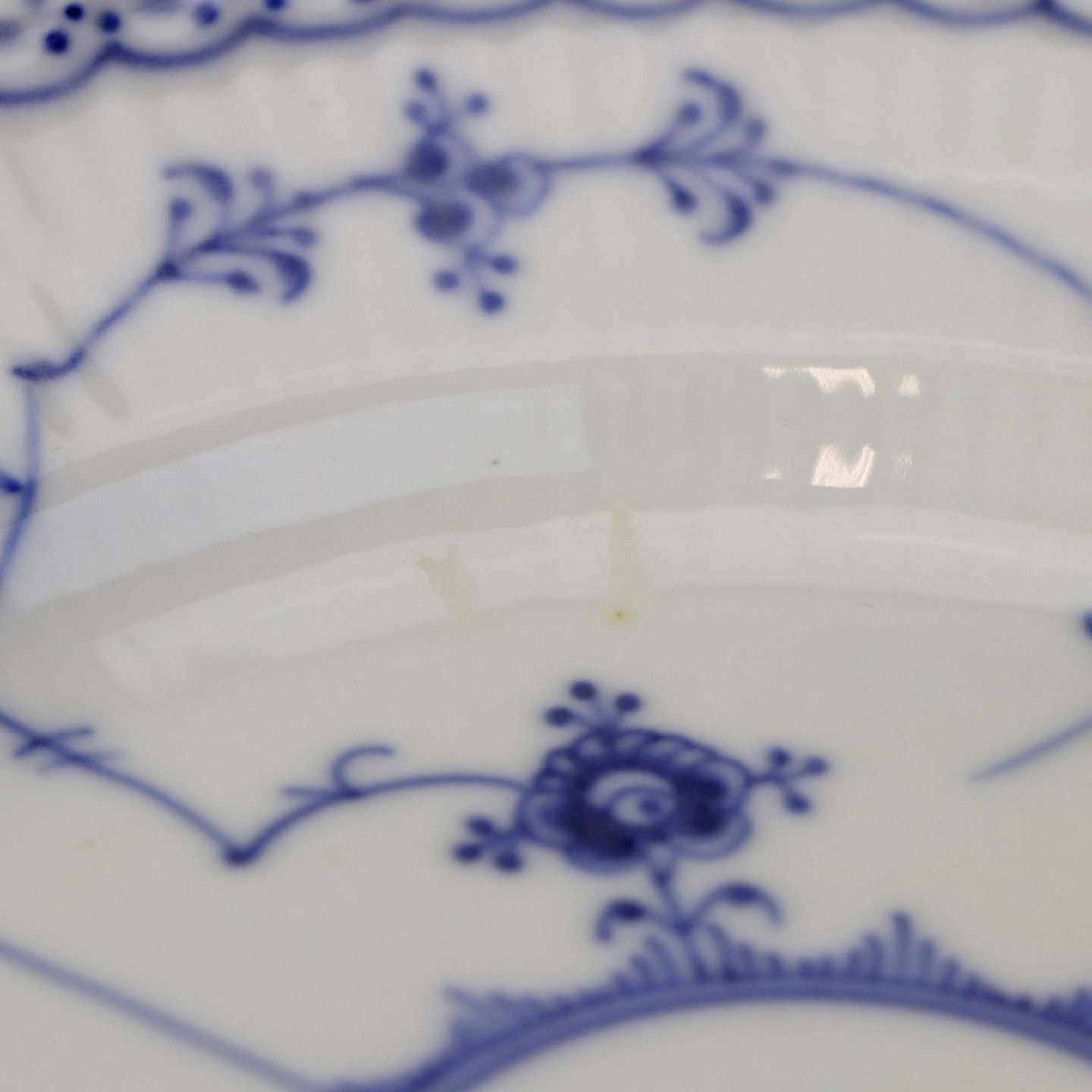 Musselmalet halvblonde er riflet hvidt porcelæn med dekoration af blå ranker og en kant med blonder.