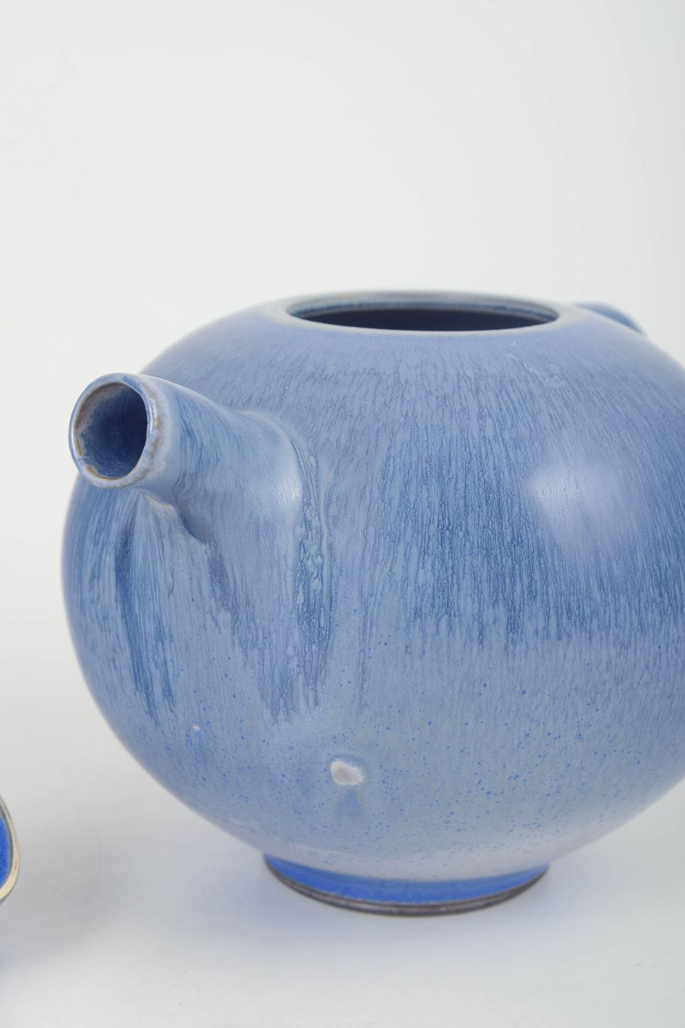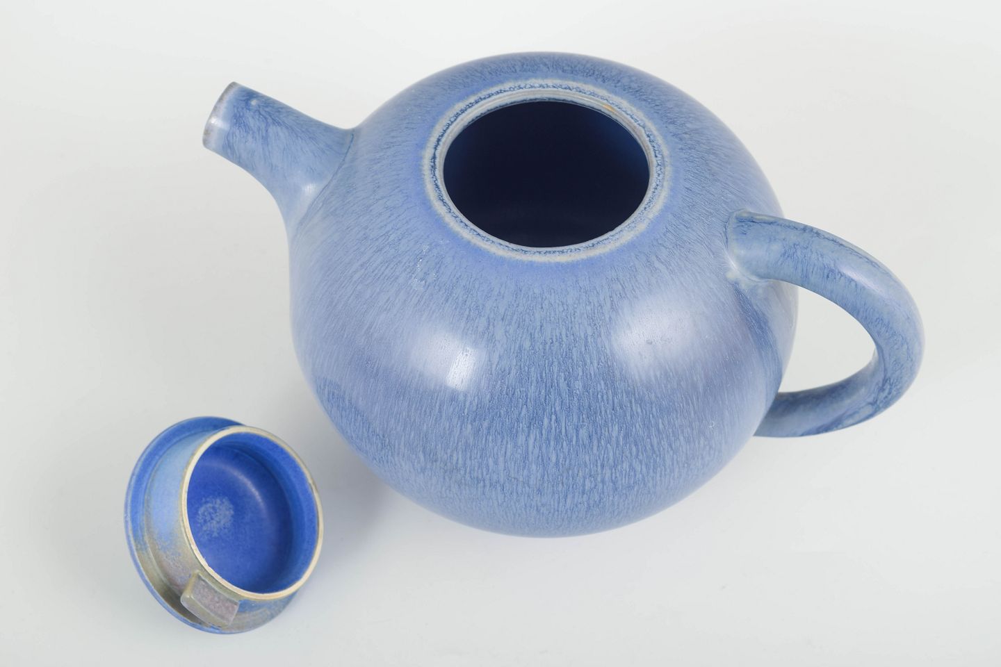 Sjælden, hånddrejet tekande i stentøj med karakteristisk blå glasur og elegant, organisk formtypisk for Fribergs tidlige studioarbejder.