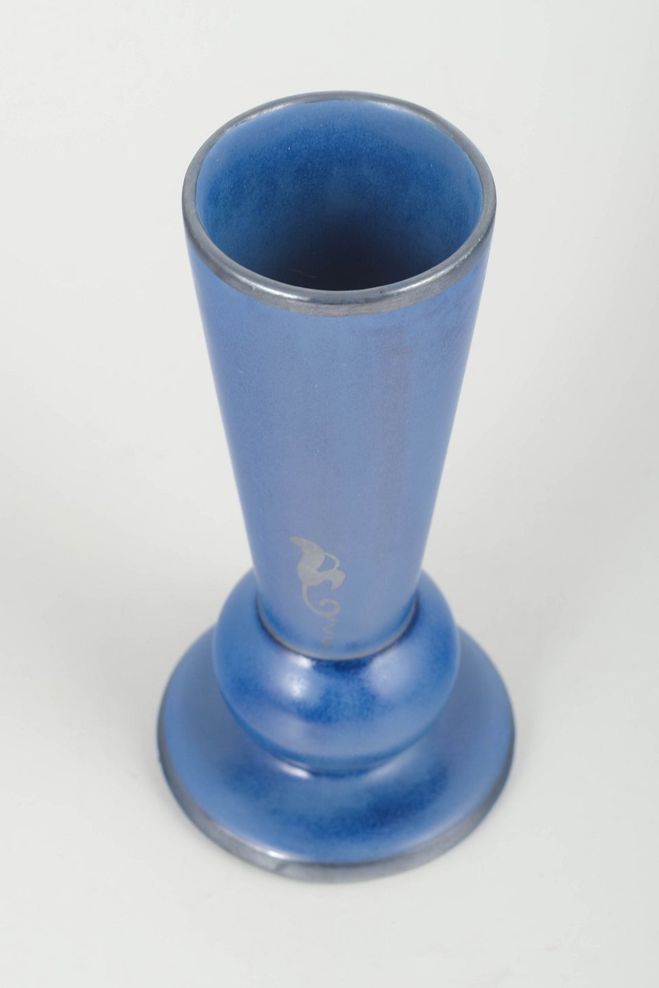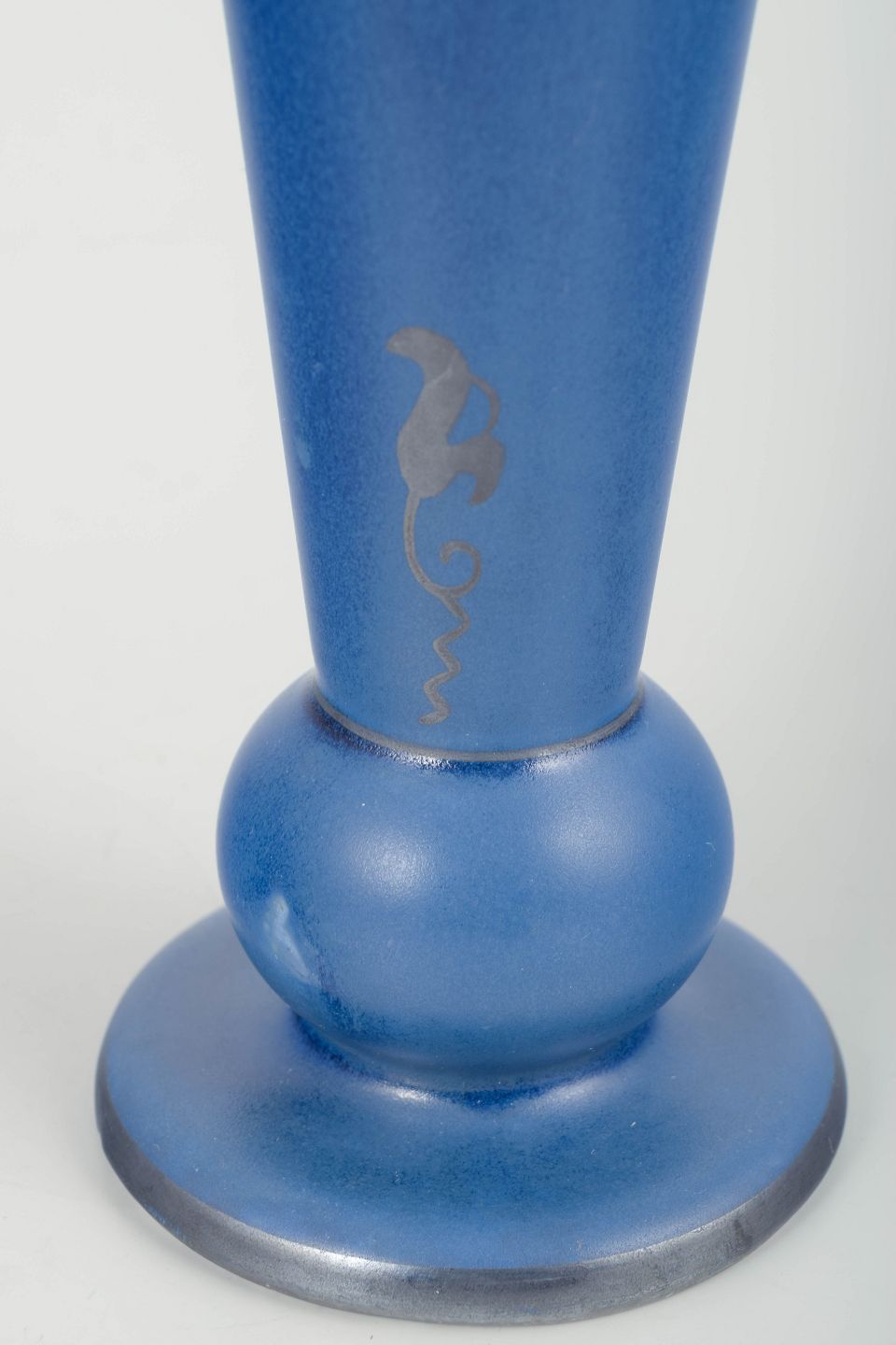 Mundblæst art glass-lignende vase i intens blå glasur med metallisk skær og stiliseret dekorativt motiv. Skulpturel form med markant rund base og konisk korpus.