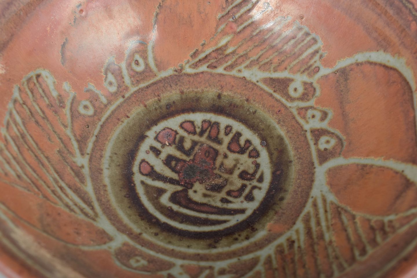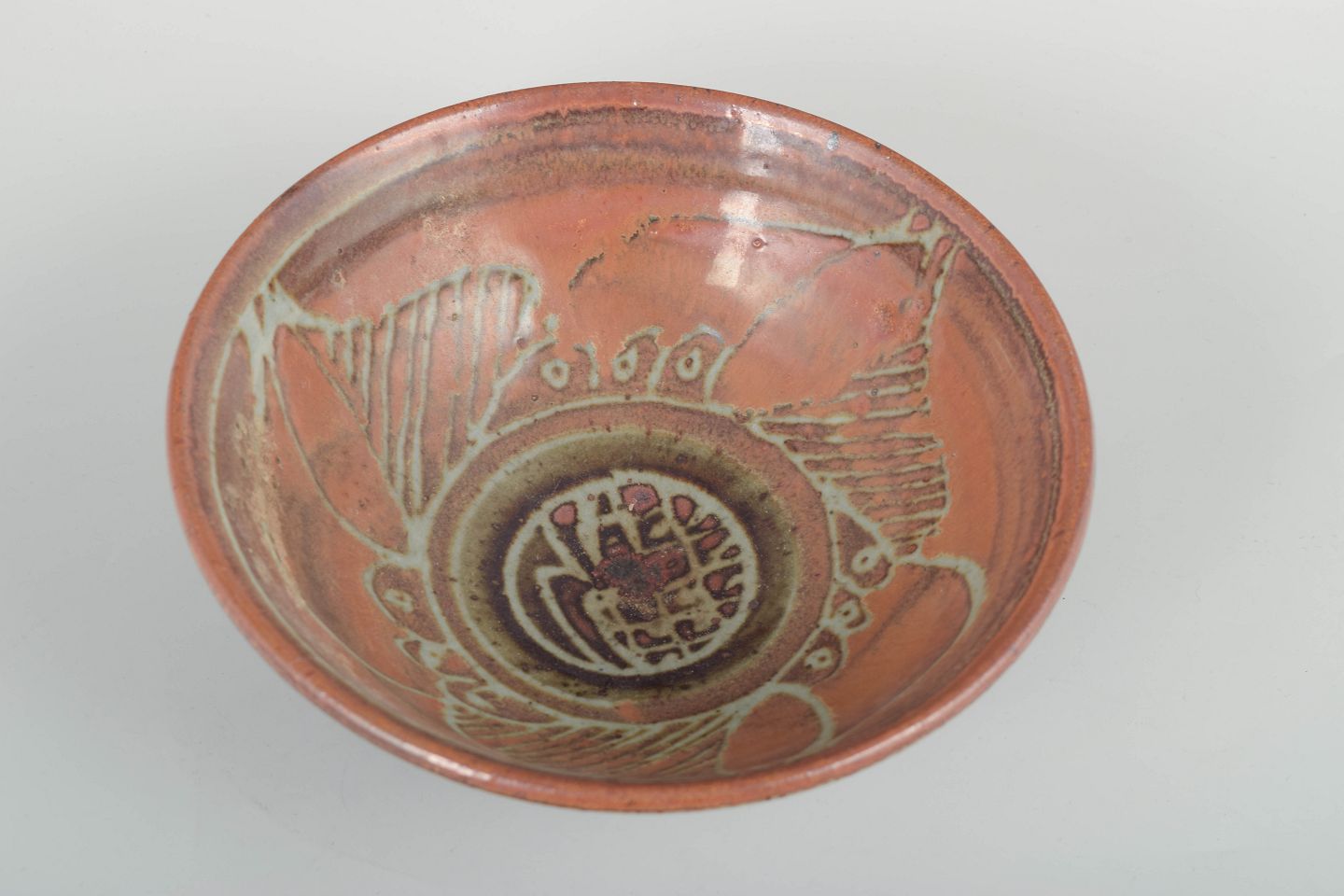 Unique bowl in Chinese-inspired style with decorative relief and brush-painted motifs, featuring a reddish-brown glaze with light contrasting elements. Signed.