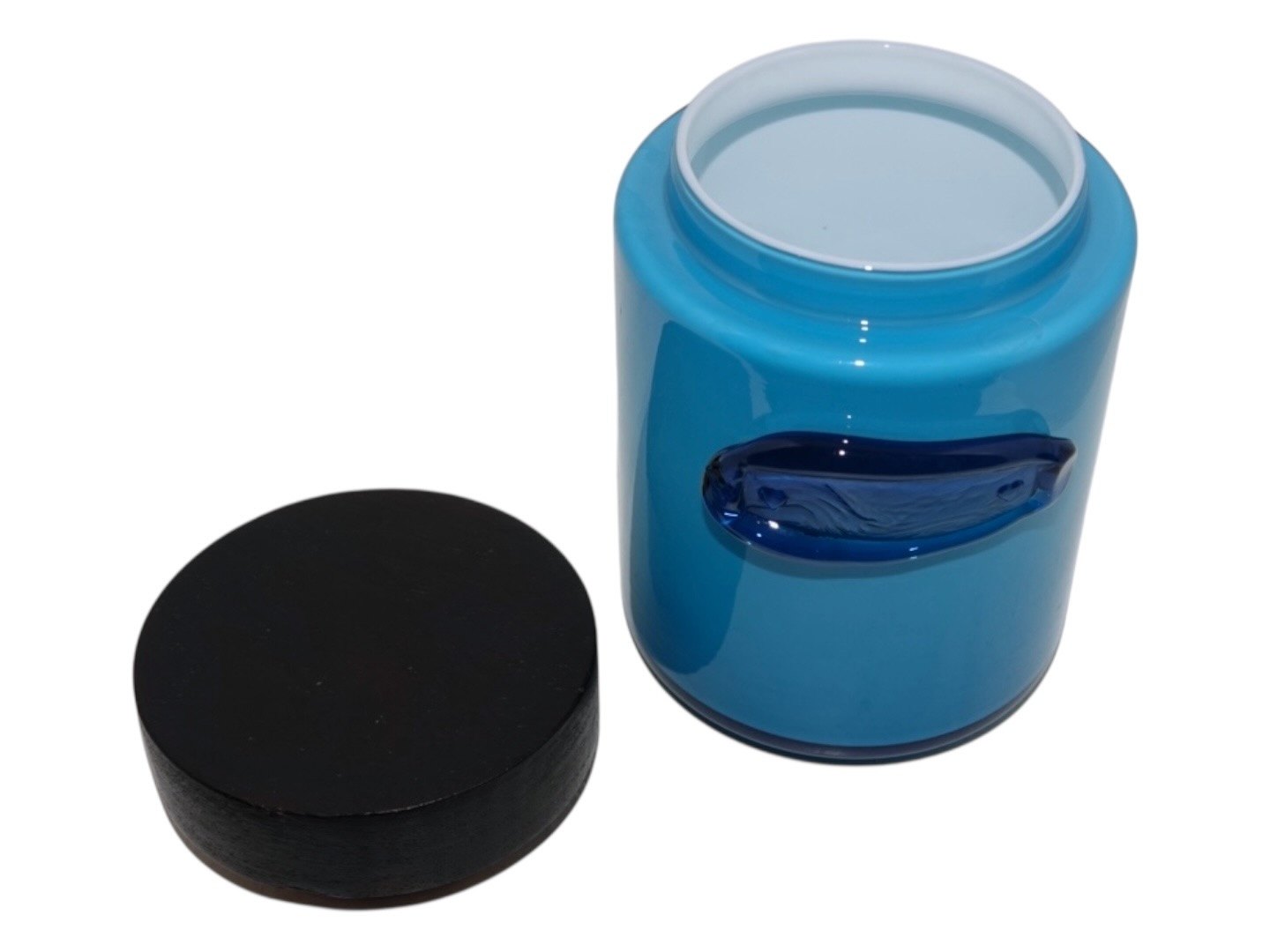 Holmegaard Palet, blå opbevaringskrukke med trælåg uden tekst.