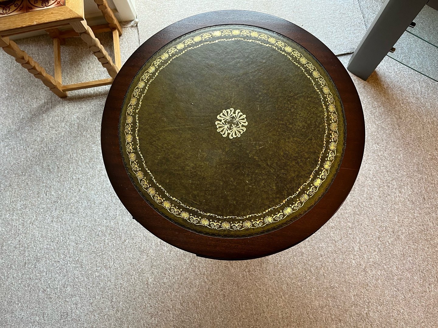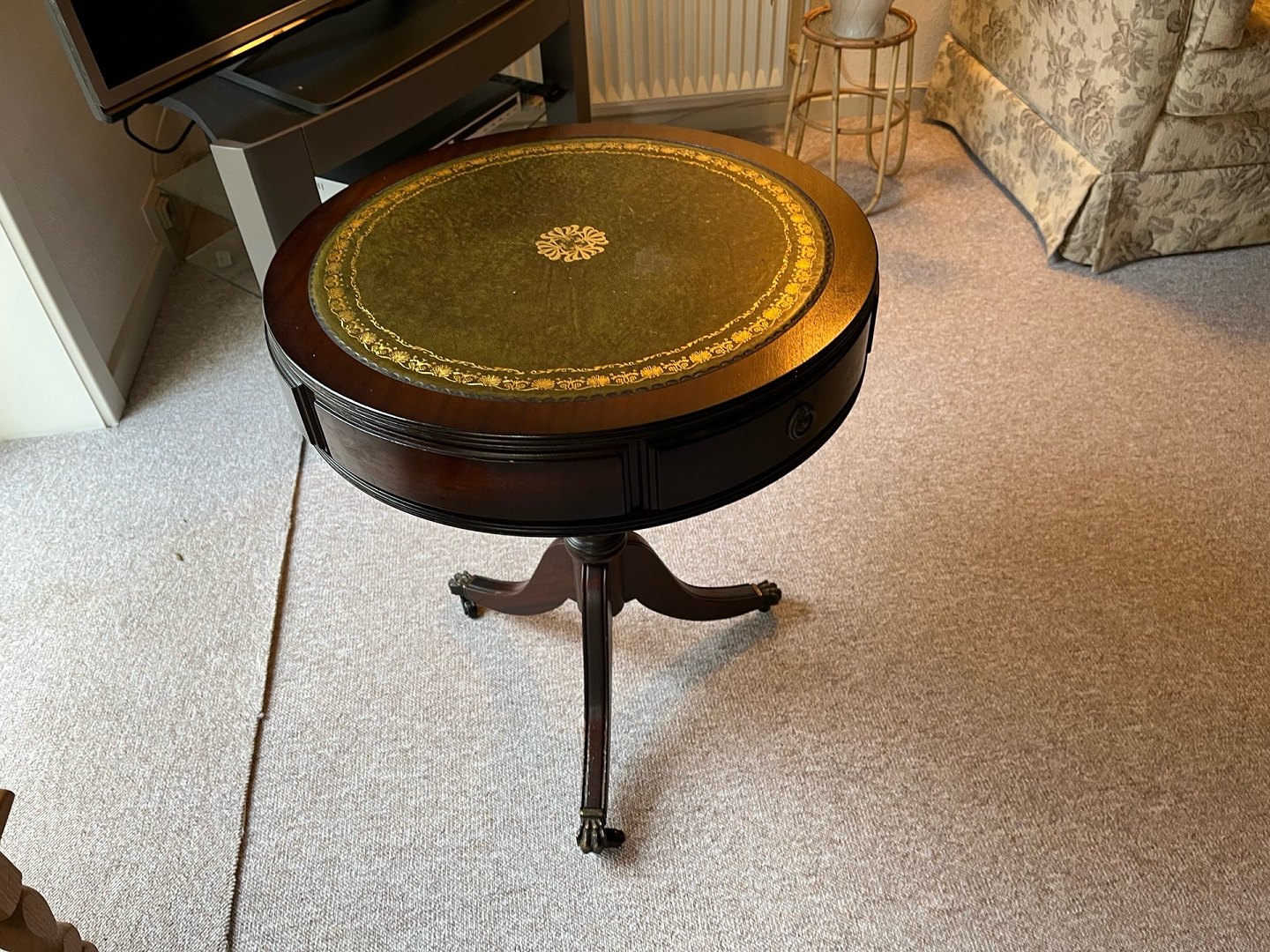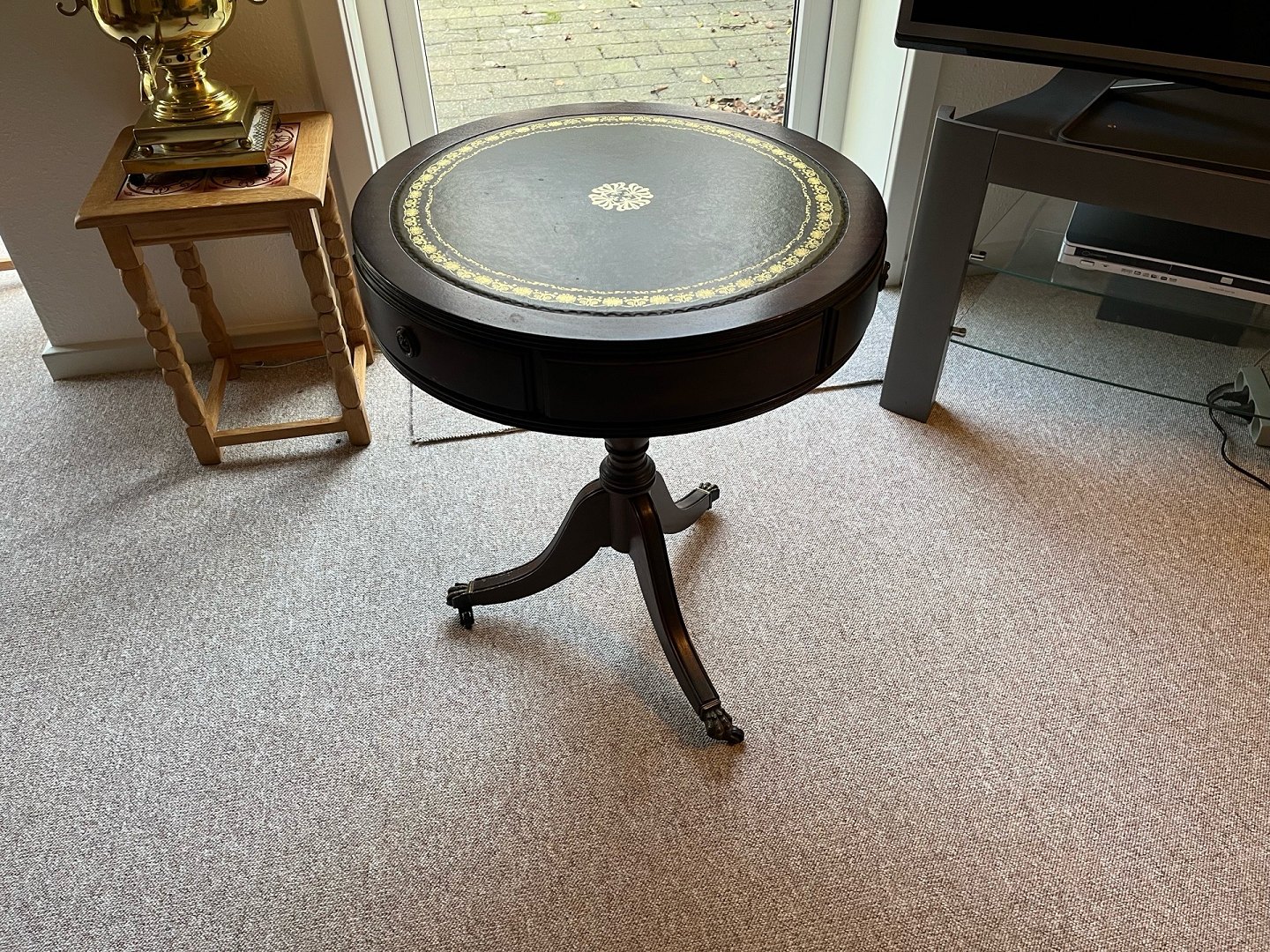English lamp table with 3 drawers and top plate with leather. Super nice condition and without any flaws.