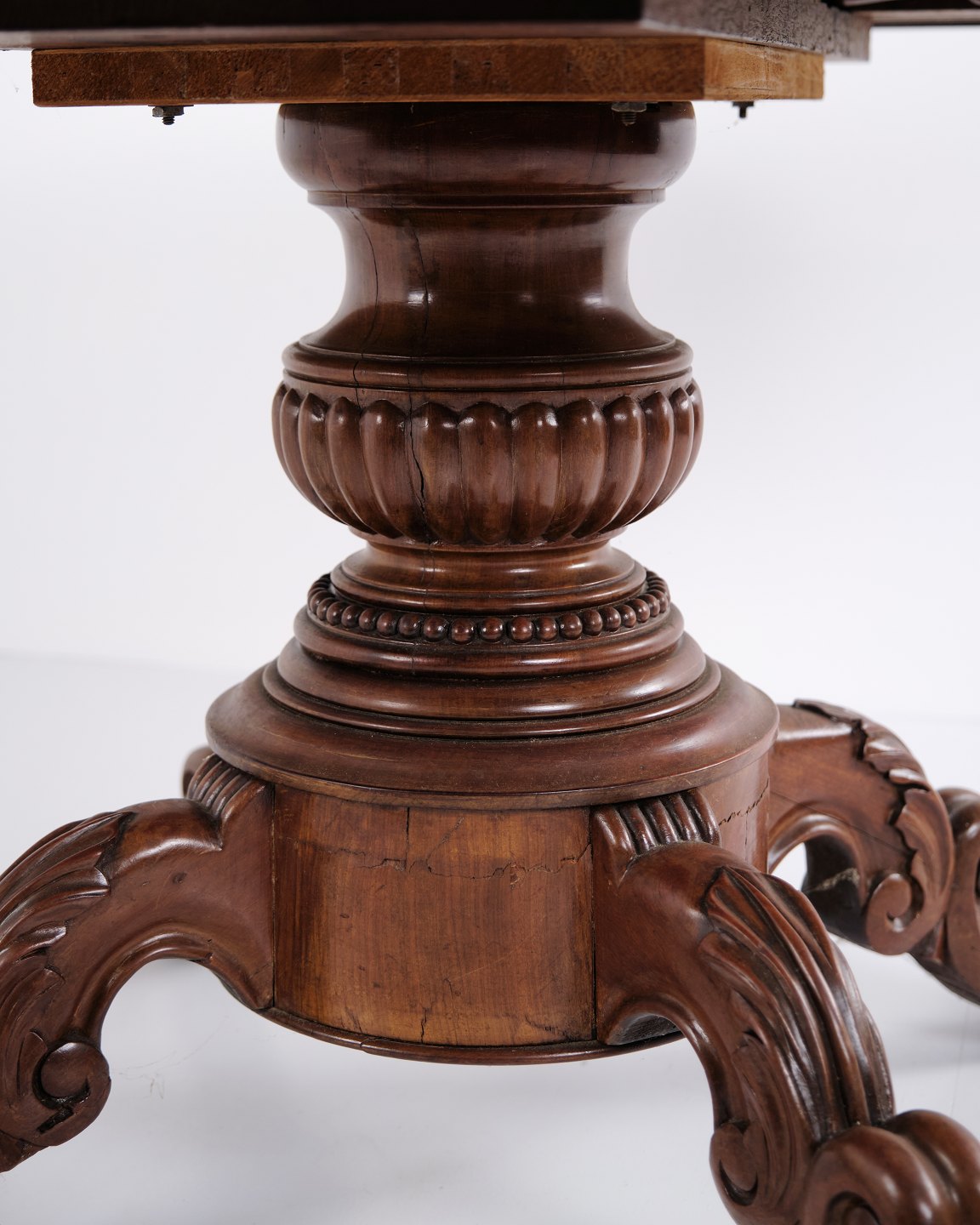 Søjlebord i sen Empire stil fra ca. 1840’erne, udført i mahogni med rige udskæringer og klassisk formsprog. Bordet kan udvides med fire tillægsplader og fungerer både som spisebord og dekorativt møbel i større rum.