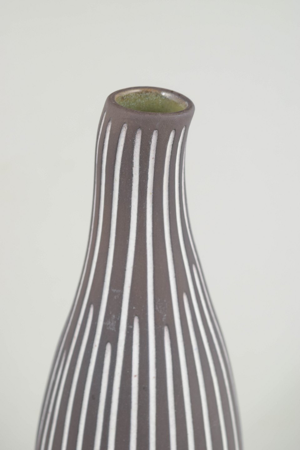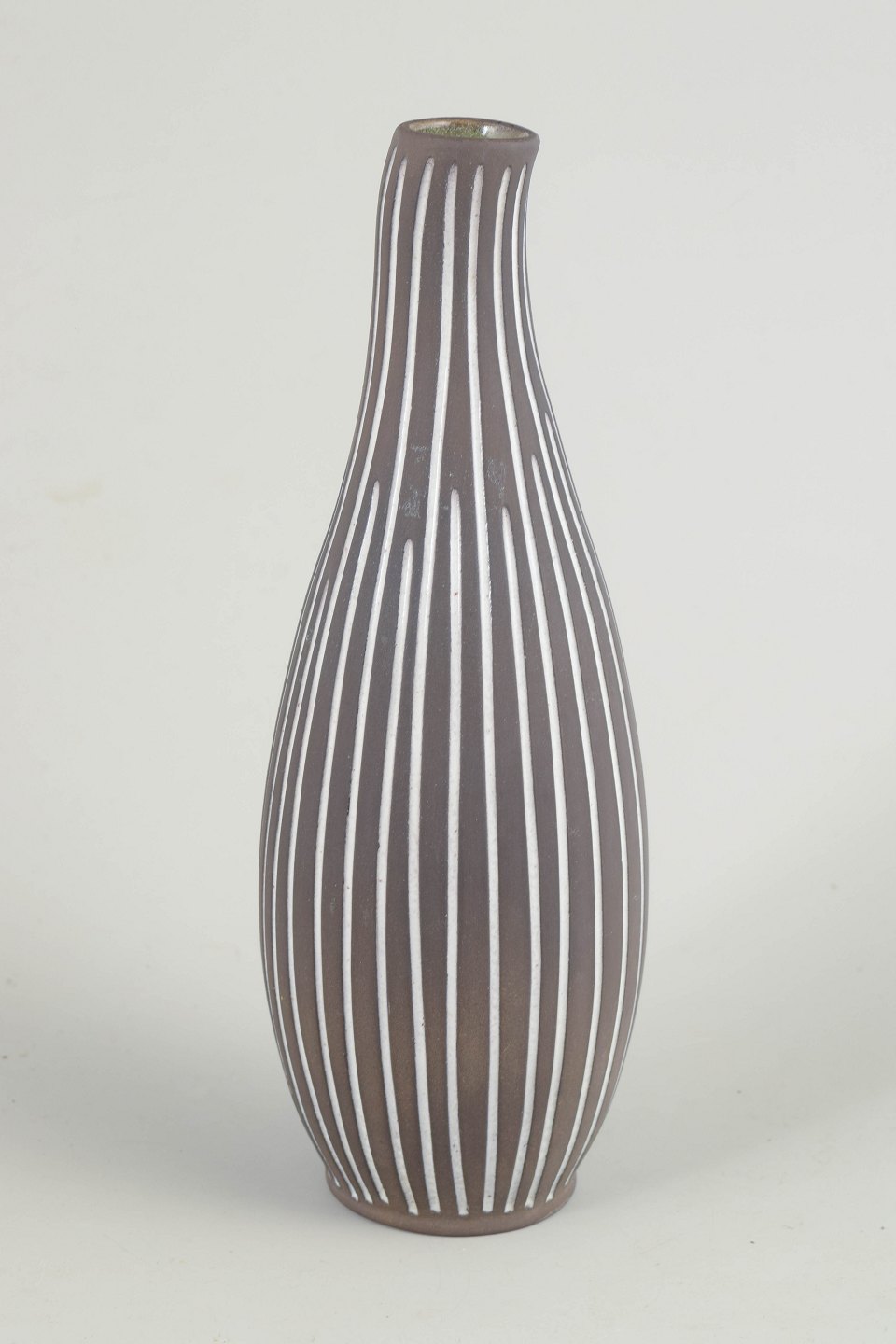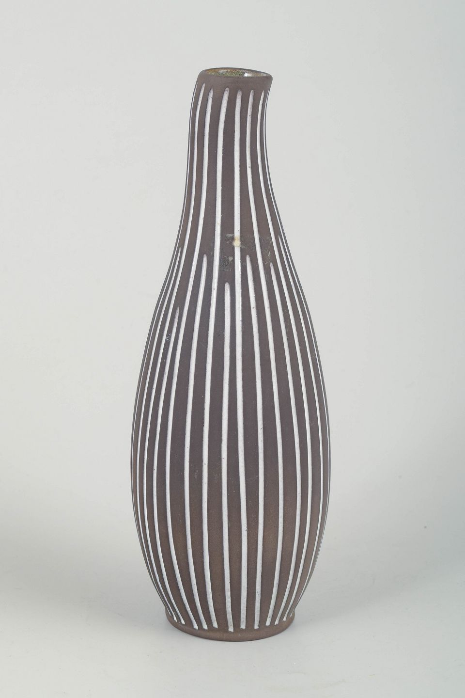 Slank, aflange vase i stentøj med karakteristisk håndmalet hvid stribedekor på mørk brun bund. Elegant, nordisk modernistisk formsprog.