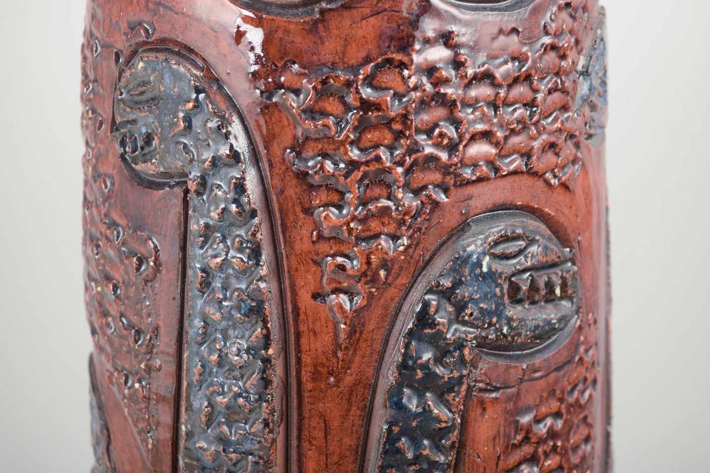 Imponerende chamotte-gulvvase med kraftigt modelleret relief og dekorativ glasur i rødbrune, blå, turkise og hvide nuancer. Forsiden prydes af stiliserede, opstigende drageformer – et karakteristisk motiv for Zawadzkis arbejde i 1960’erne.