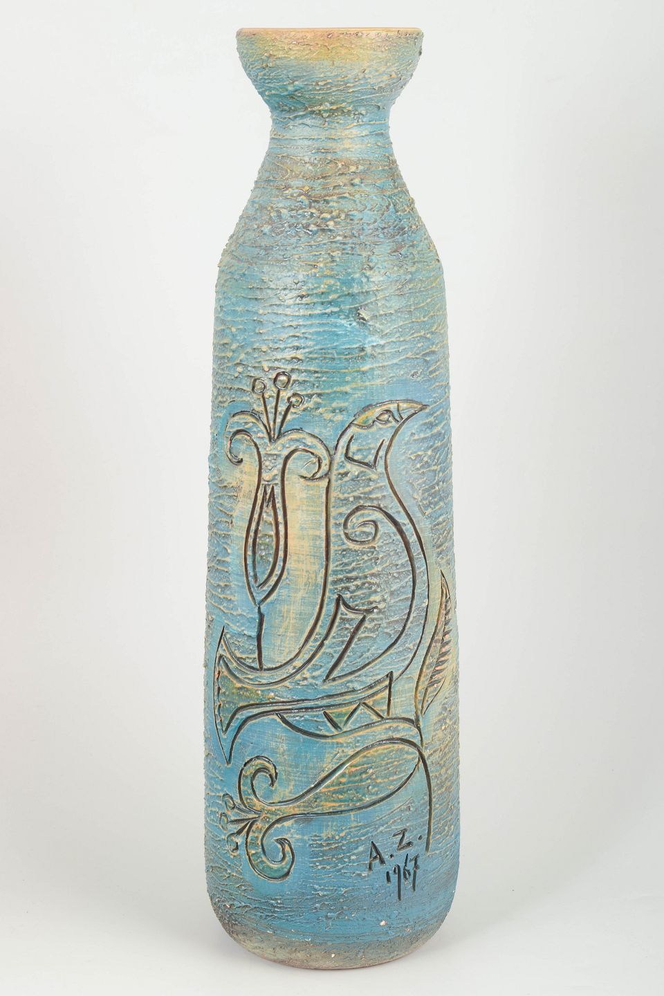 Ekstremt dekorativ og høj cylindrisk gulvvase i chamotte-ler med rillet overflade og karakteristisk inciseret dekoration af stiliseret fugl og blomster. Glasur i blå, grønne og sandfarvede nuancer.