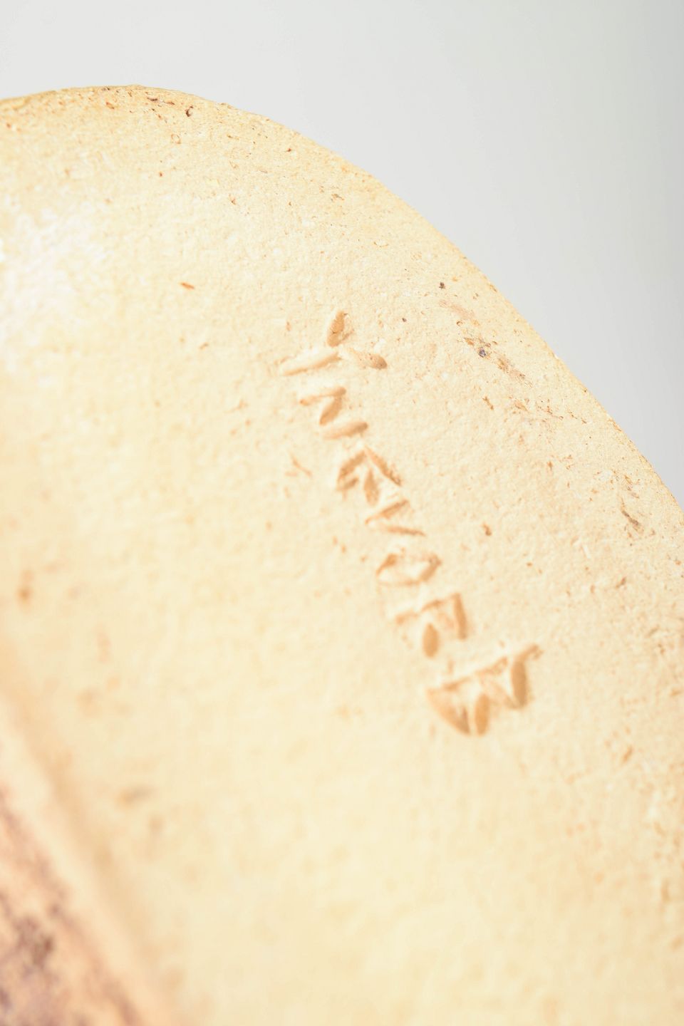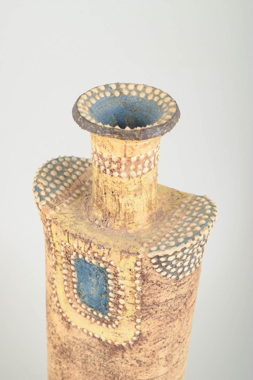 Høj, rektangulær studiovase i stentøj med kunstnerisk, mønsterdekoreret overflade i sand- og jordtoner samt indlagte blå og hvide detaljer. Skulpturel hals og karakterfuld håndbygget form.