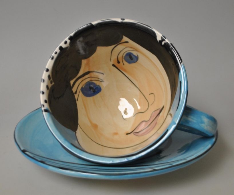 Atherley, Karen (1961 - ) England: Thekop med underkop. Med glasur og dekoration af kvindeansigt. Signeret 1972. H.: 8 cm. Dia underkop: 19 cm.