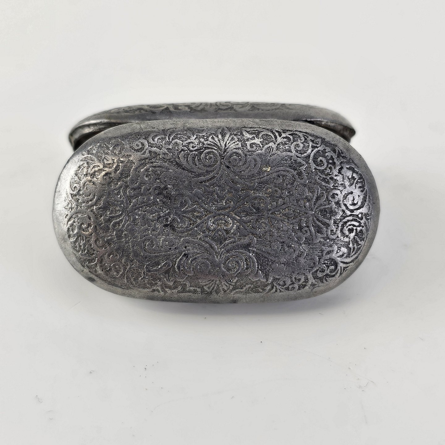 Pilleæske i tin med motiv af en dreng og en hund omgivet af bladmotiver