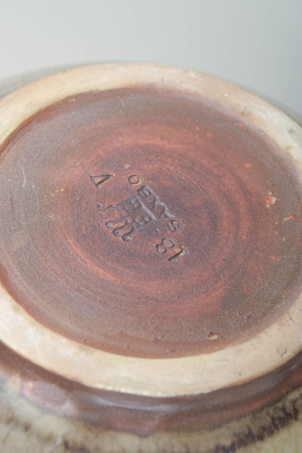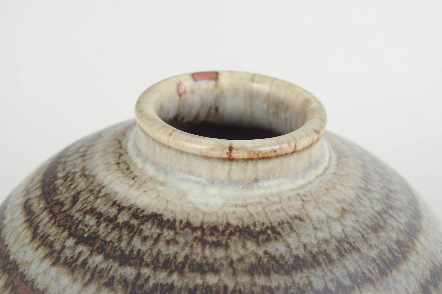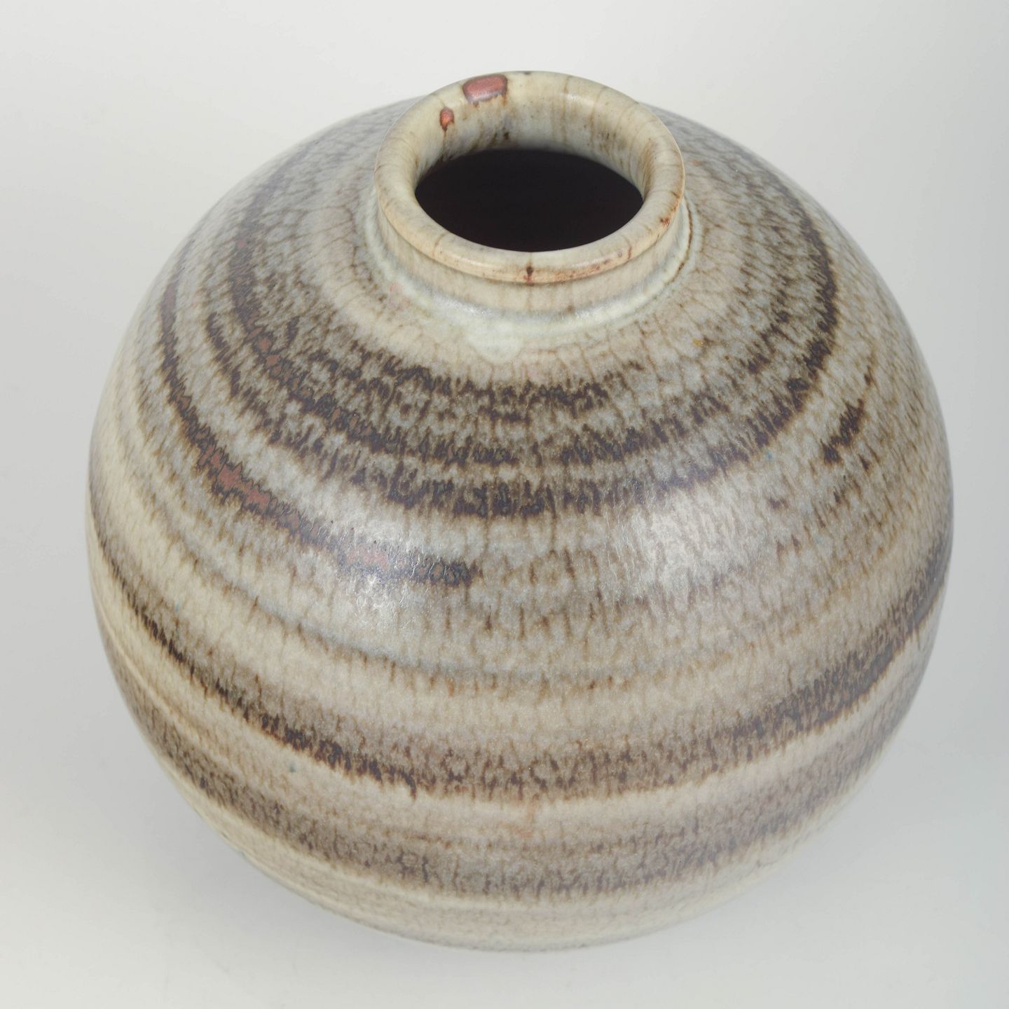 Stor kugleformet vase fra Saxbo med tidligt værkstedsstempel, udført i 1930’erne. Vasen har en smuk, levende hareskinds-/stribet løbende glasur i nuancer af brun, grå og beige, karakteristisk for Saxbos tidlige eksperimenterende stentøjsproduktion.