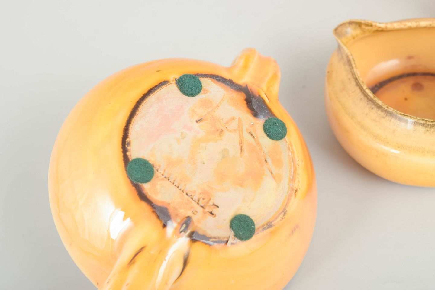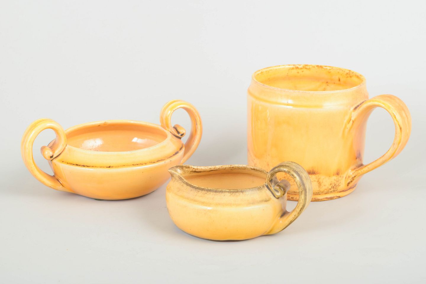 Tre dele i den klassiske Kähler-palette af varme gul-orange glasurer fra 1930’erne. Sættet består af en lille flødekande med dekorativt svunget håndtag, en sukkerskål med dobbelthanke i spiralform samt et større krus/bæger med markant hank. Fine proportioner og karakteristisk håndværkspræget formsprog.