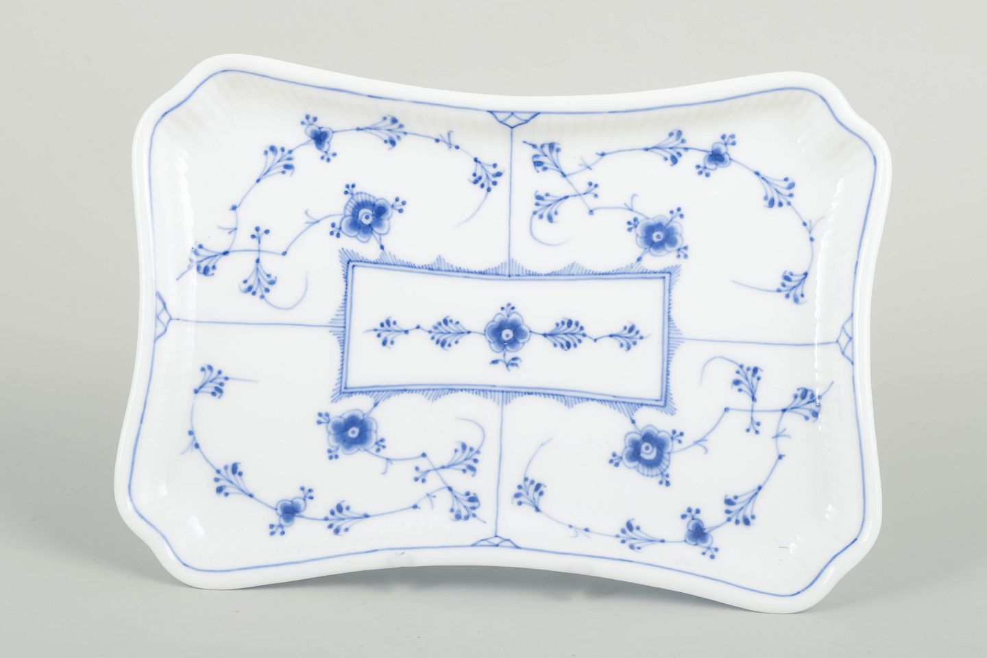 Elegant rektangulær bakke i musselmalet riflet porcelæn, med blødt svungne kanter og klassisk håndmalet koboltblå dekoration på riflet korpus. En smuk og sjældnere form fra Royal Copenhagens tidlige 1900-tals produktion.