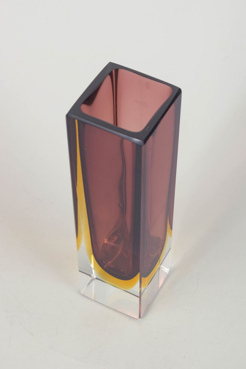Rektangulær Murano-vase i lagdelt sommerso-glas med klar ydre krop, dyb ametystfarvet indre kerne og varme gule overgange. Et elegant eksempel på 1960’ernes italienske glasdesign, kendetegnet ved skarpe linjer og optiske farvespil.