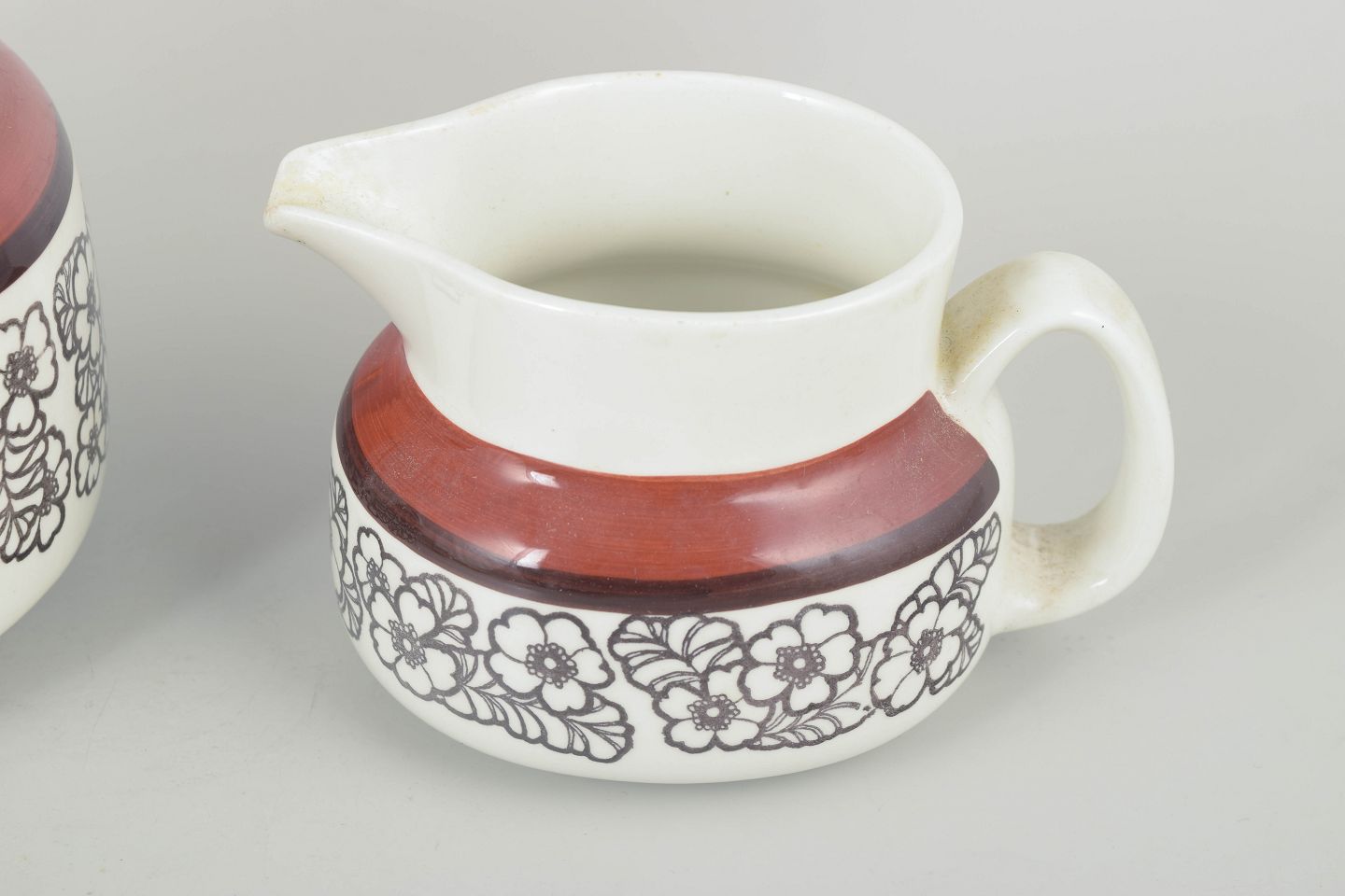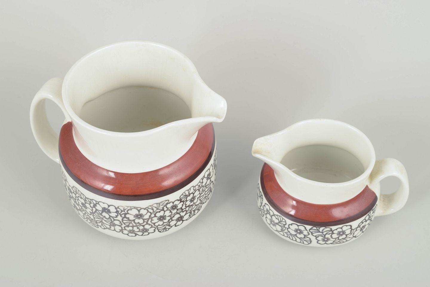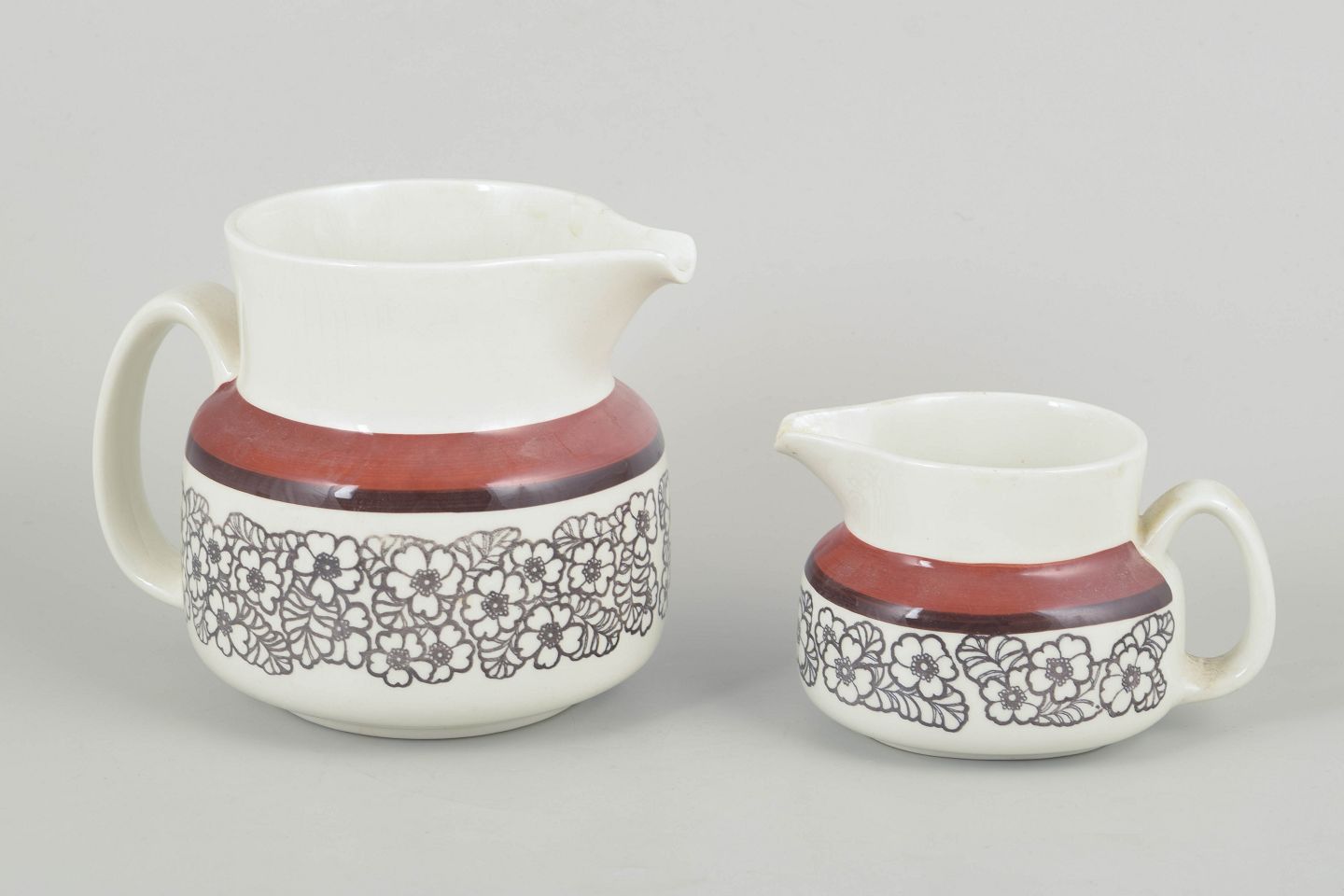 Sæt bestående af to stentøjskander i forskellige størrelser, dekoreret med den karakteristiske Agneta-blomsterfrise og den varme rødbrune kant. Funktionelle former med et tydeligt 70’er-udtryk. Mindre craquelurer forekommer.