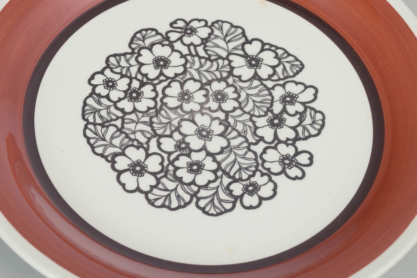 Sæt på 4 store stentøjstallerkener med den karakteristiske Agneta-dekoration: et grafisk blomsterfelt i sorte linjer omgivet af en varm rødbrun kant. Et klassisk 70’er-design fra Gefle med et både dekorativt og funktionelt udtryk.