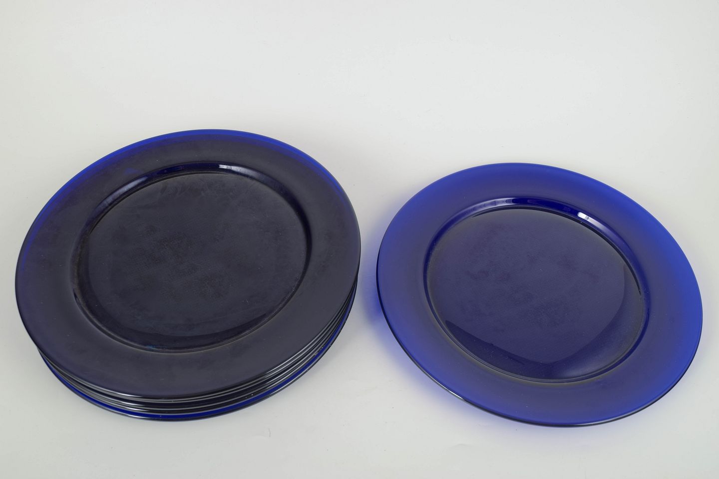 Sæt på seks dybblå dæktallerkener i tykt, transparent kunstglas. Den klare, mættede koboltblå farve og den enkle runde form giver et elegant og tidstypisk udtryk, typisk for skandinavisk glasdesign fra 1980’erne.