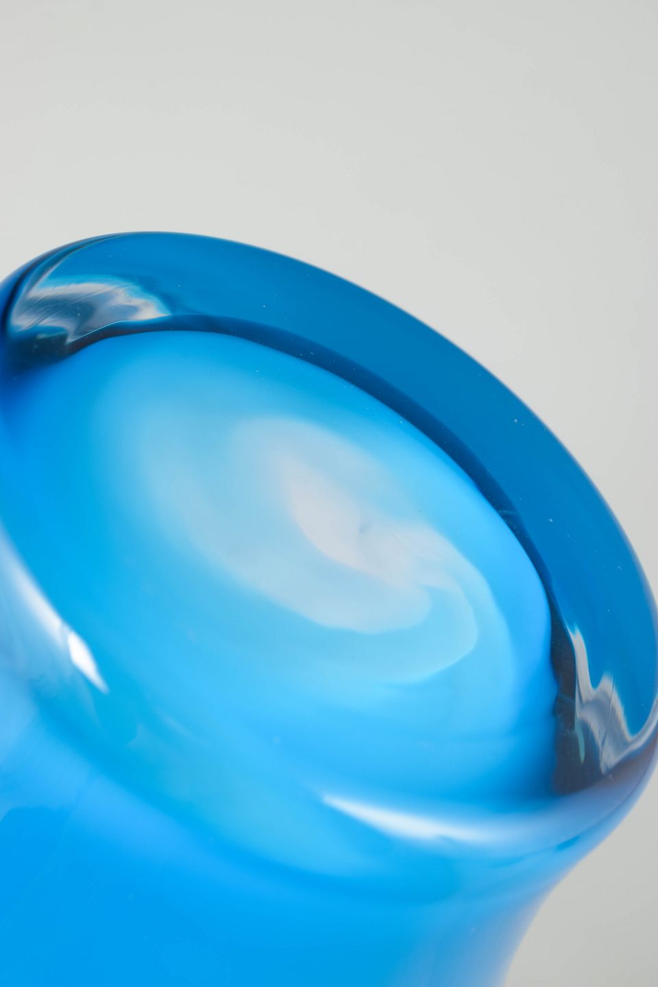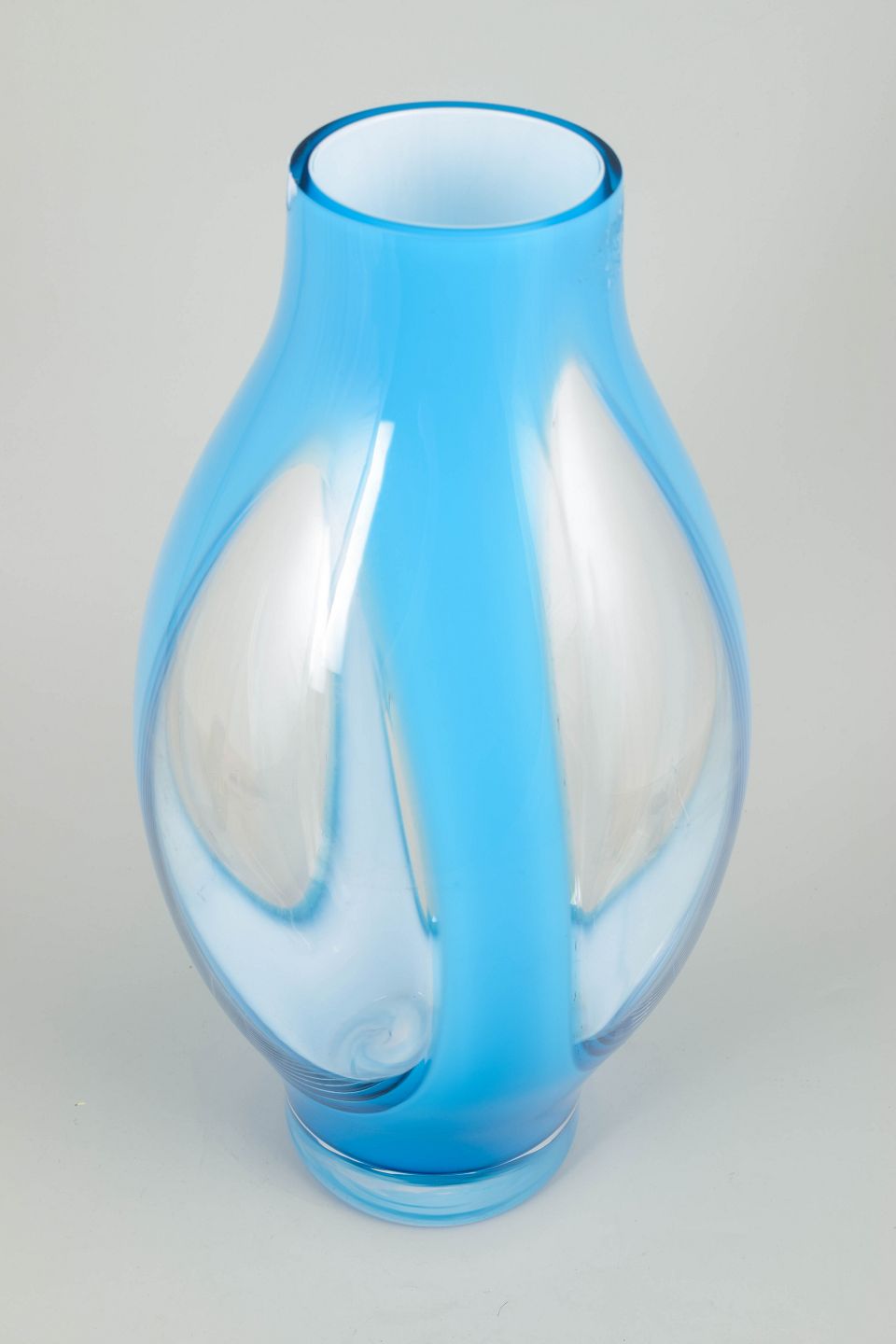 Imponerende, skulpturel kunstglas vase fra Kosta, udført i kraftigt lagdelt glas med markant optisk effekt. Den elegante, organiske profil kombineret med den klare og blåtonede glasmasse giver et stærkt moderne udtryk.