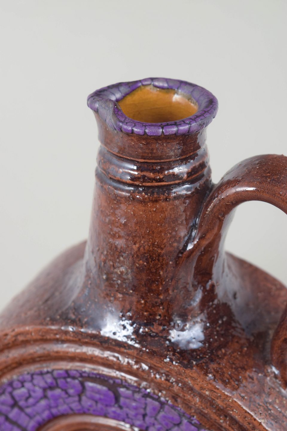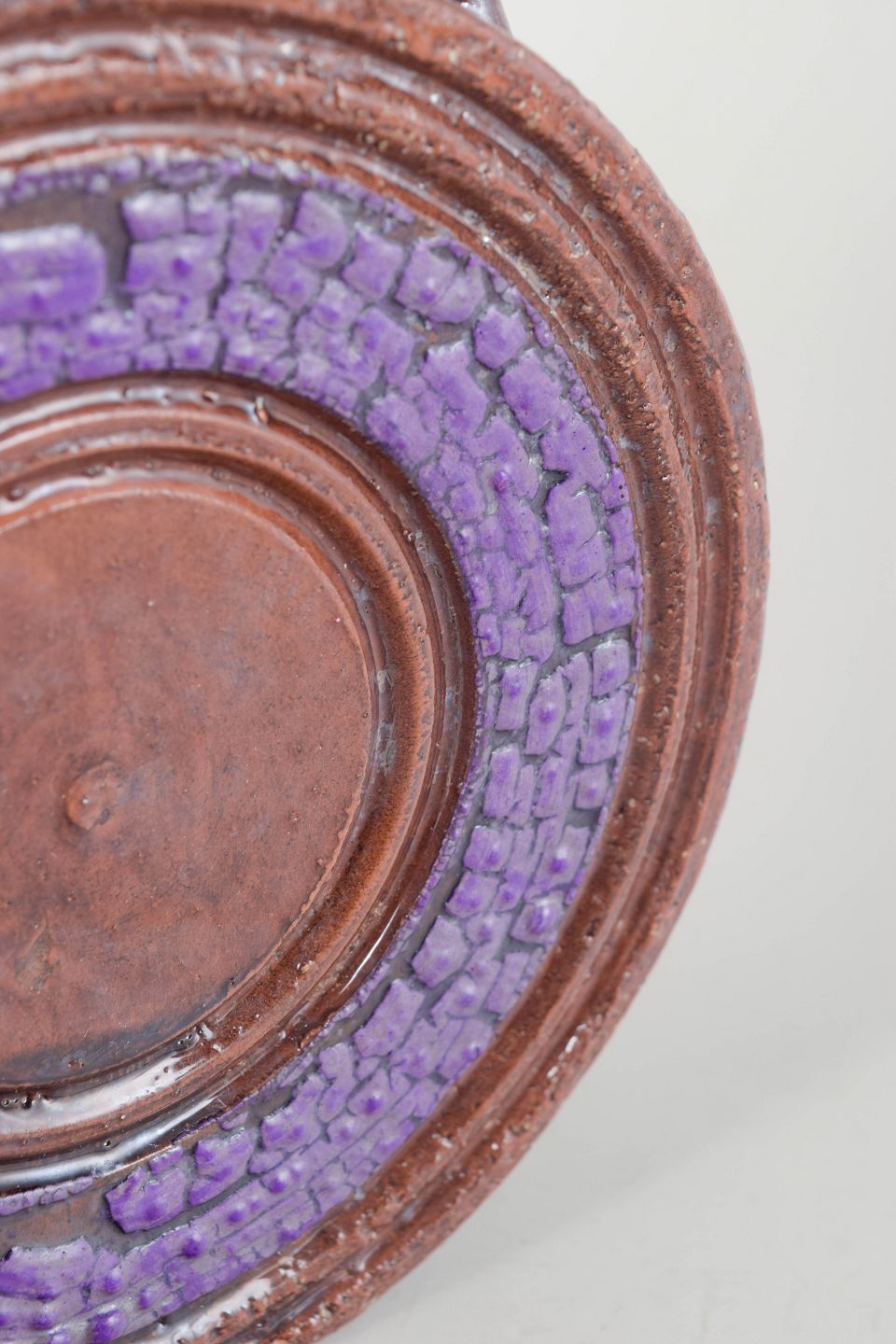 Dekorativ italiensk vin-karafel i glaseret terracotta med karakteristisk cirkulær reliefdekoration og lilla glasur i midterfeltet. Den organiske form, hankens bløde kurve og de stærke farver giver et klassisk Bitossi-udtryk fra perioden.