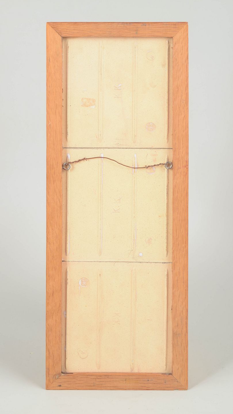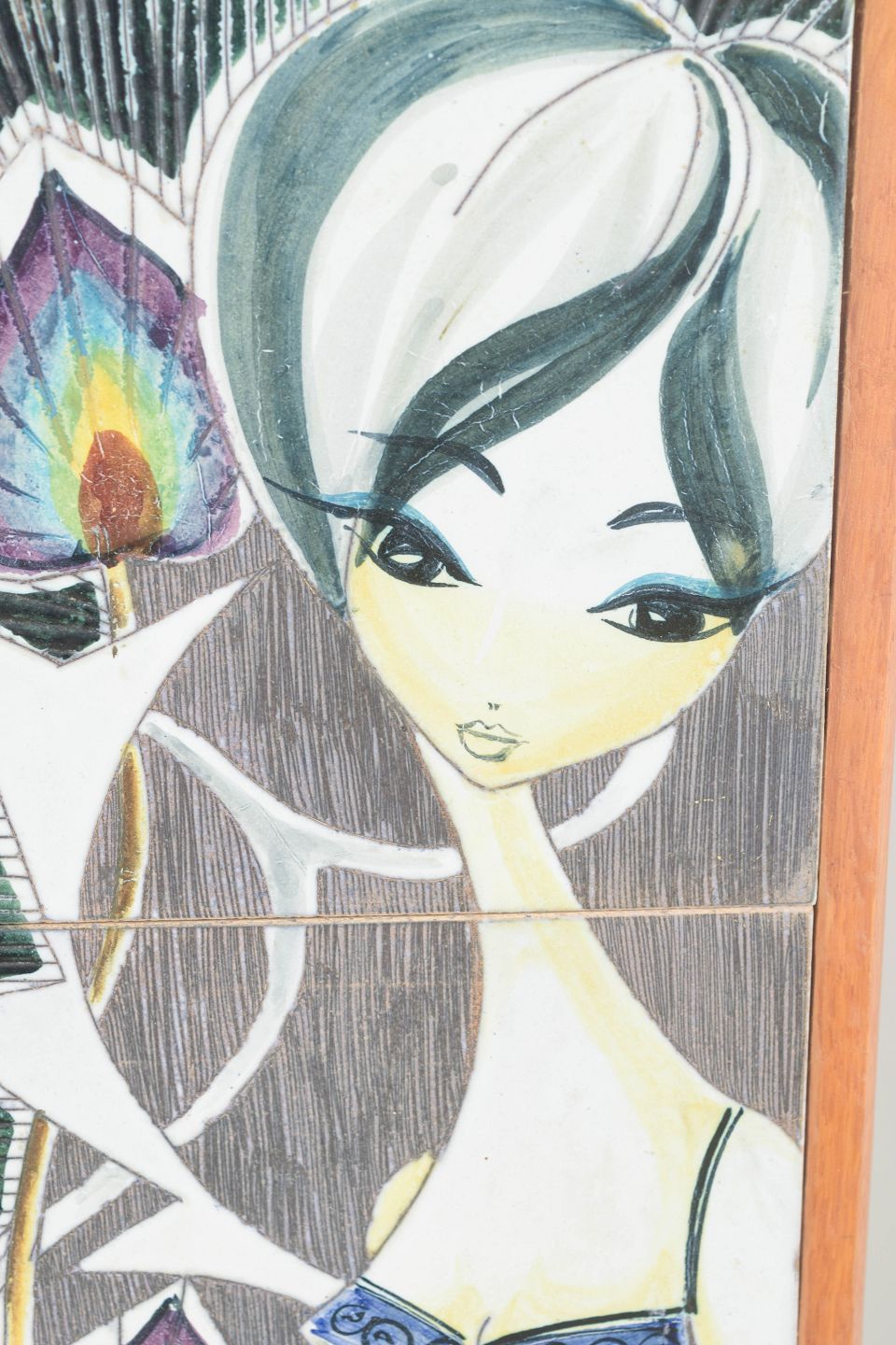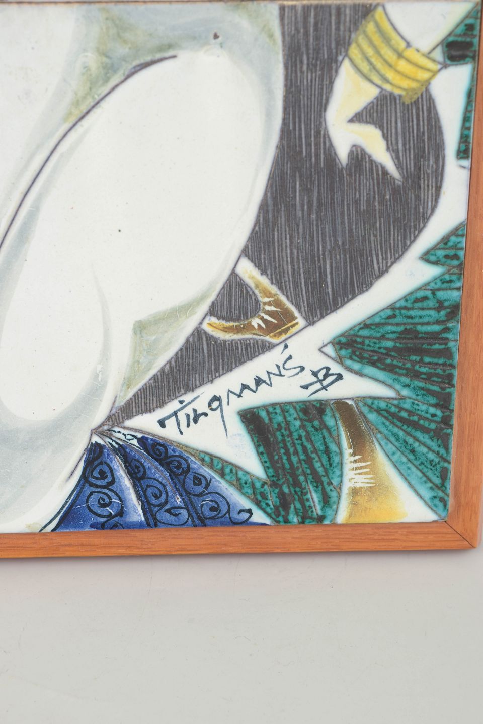 Dekorativ keramisk vægplakette håndmalet i den karakteristiske stil af Yngvor Blomström for Tilgmans, Göteborg. Motivet forestiller en stiliseret kvindefigur med markante grafiske linjer og farvede detaljer, typisk for Tilgmans’ moderne formsprog i perioden. Signeret.