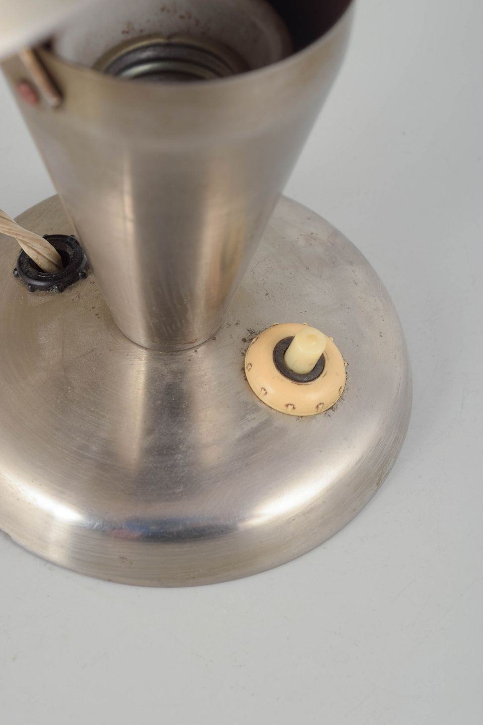 Tidlig modernistisk bordlampe i børstet stål med svampeformet skærm og konisk fod. Et karakteristisk eksempel på tjekkisk funktionalistisk belysningsdesign fra mellemkrigstiden, hvor rene linjer og industrielle materialer dominerede.
